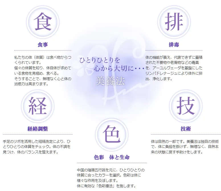 大学病院にて看護師として従事。 娘が病気になり、救う手立てを必死に探すうちに体質の違いに気づいたことが、この仕事を始めるきっかけでした。 体質をつくるのは「食」。食の大切さと、体の中に溜まってくる様々な不要なものを排出すること 〔これを中国医学では「瀉(しゃ)」といいます〕の必要性を伝えていこう!と考え、健康づくりの考え方「美養法(びようほう)®」として名づけました。 会社名の「美養」は「美を養う」ということ。 私が考える美とは、「体の健康美(外見的な美しさと体内の器官の健康が表に現れたコンディションの良さ)」と「心の健康美(ストレスフリーなコンディション)」です。 美養法の考え方によって開発・厳選された、安心で確かな製品の活用を通じて、家族の笑顔を応援することが私達の使命と考えています。