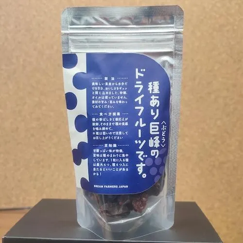 大粒でジューシーな安心院産巨峰を種ごとドライ加工。種の食感がアクセントとなり、ワインやチーズとのペアリング提案にもおすすめです。農地直送ならではのクオリティを実感できます。