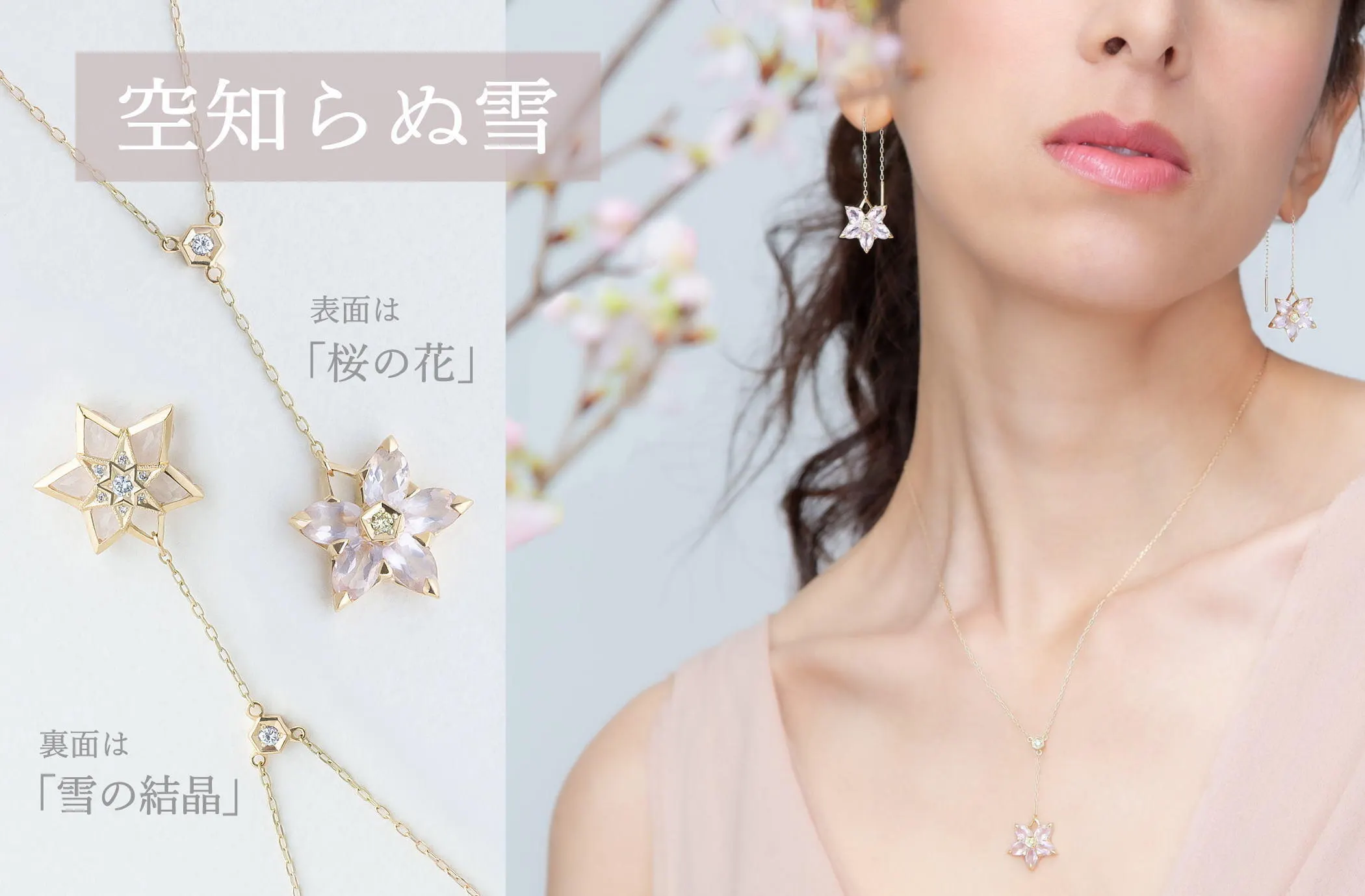 表面は「桜の花」、裏面は「雪の結晶」をイメージした桜ピアス・ネックレス。