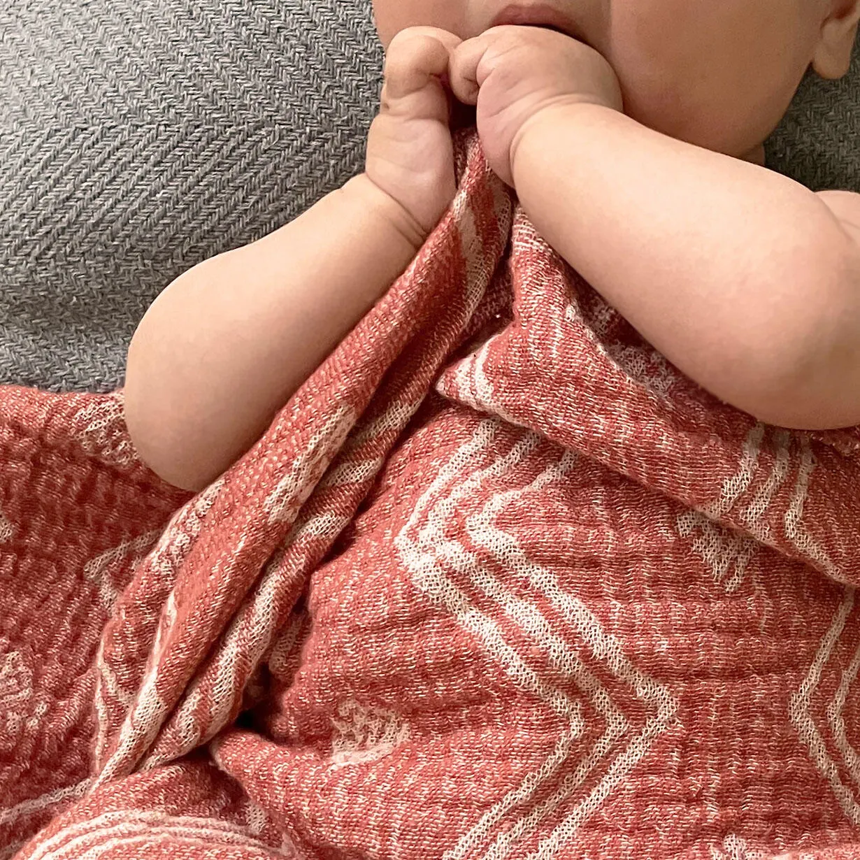 「Paloma(パロマ)」は、深みのあるテラコッタ色と幾何学的なジグザグ模様が印象的。トルコの伝統文様にインスパイアされ、ガーゼコットン素材の柔らかさと肌なじみの良さが際立ちます。敏感肌や赤ちゃんにも安心して使えるため、出産祝いなどのギフトにも選ばれています。