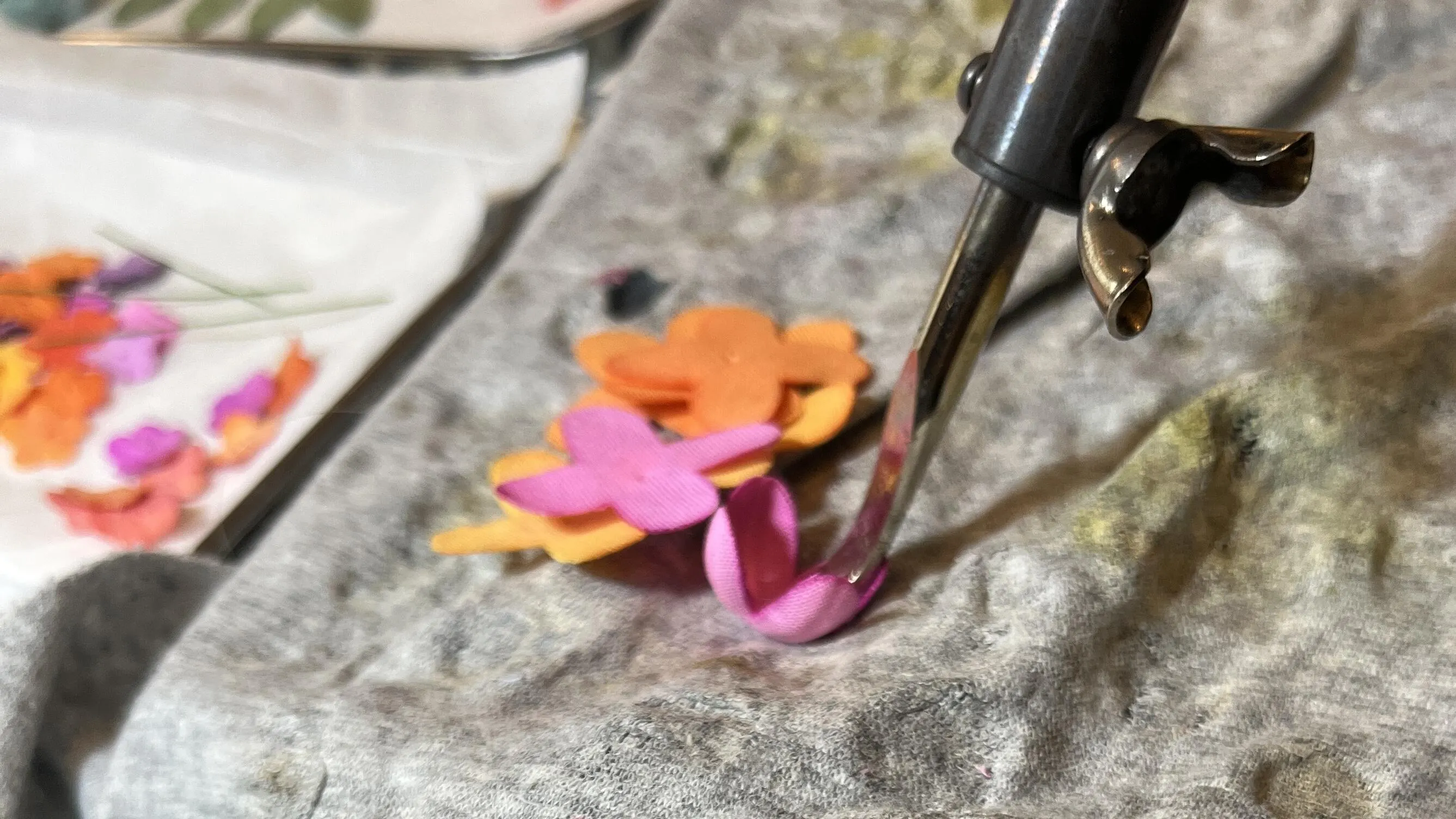 時間がかかっても草花は布で一から制作します。花の種類によって、綿、シルク、ビロード、など生地の種類も変えています。