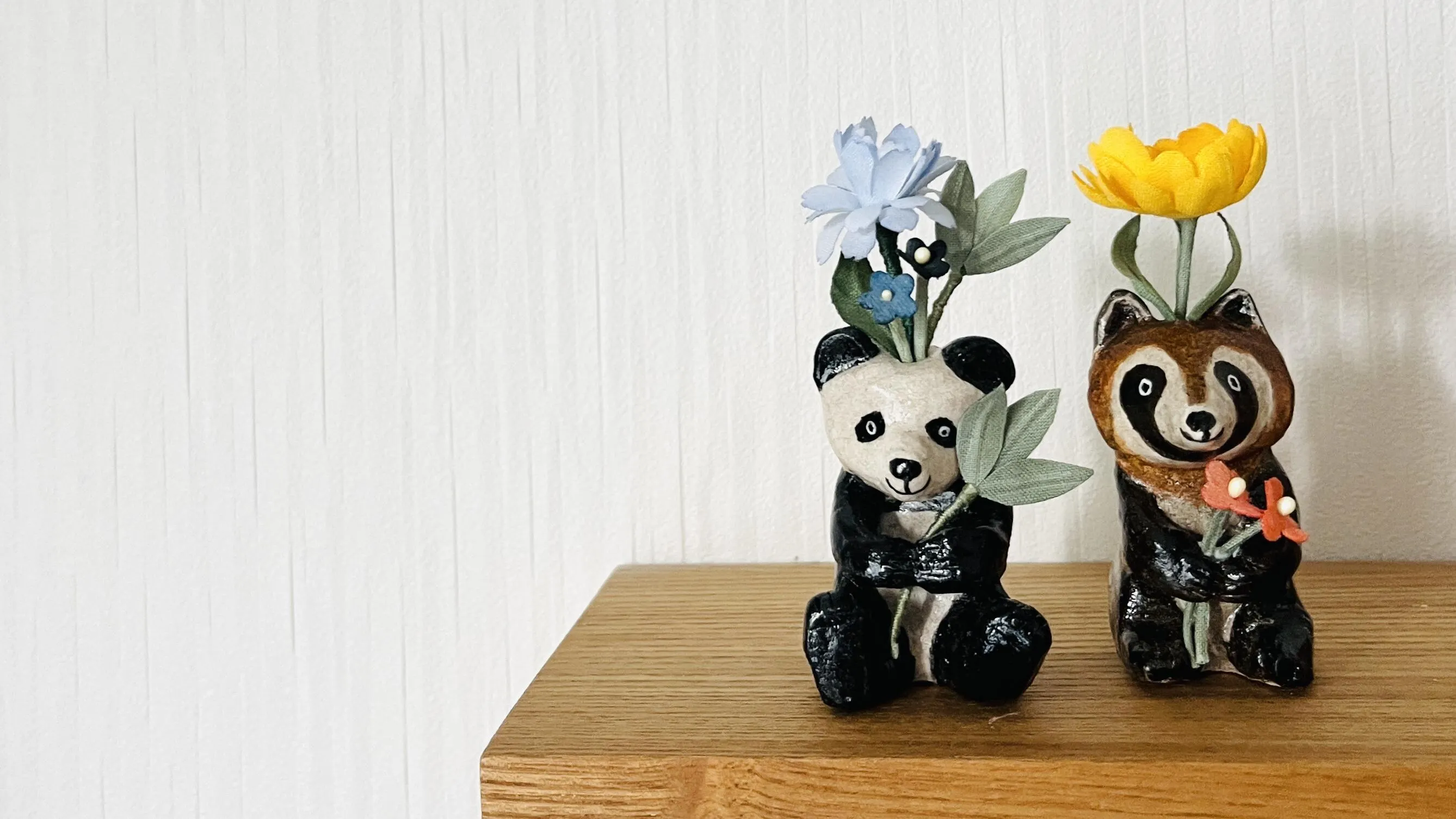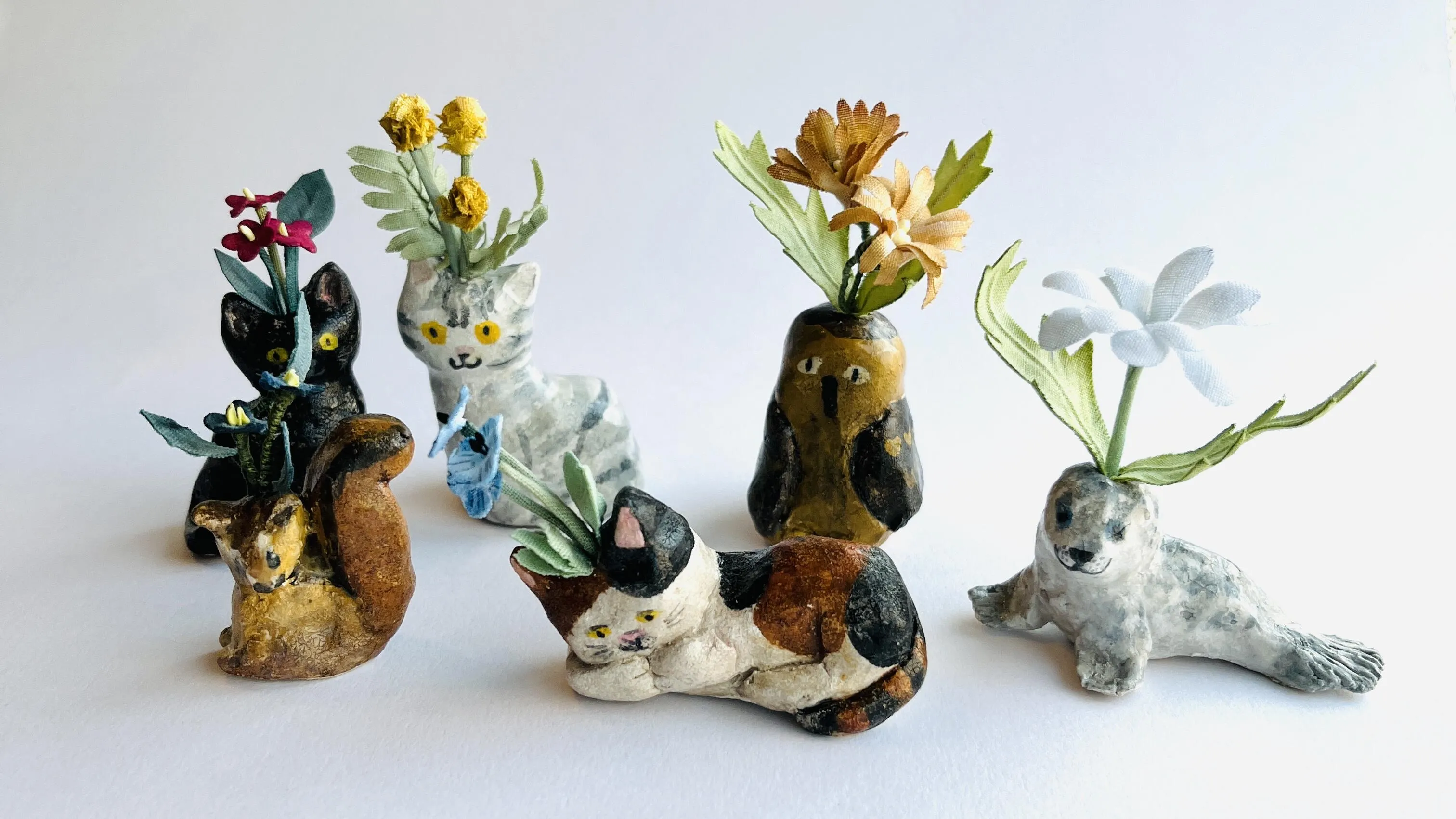 動物が草花を纏っている置物を心を込めて制作しています。 ほんの一瞬でいい、ほっとしたり, 優しい気持ちになれるような作品を届けたいと考えています。