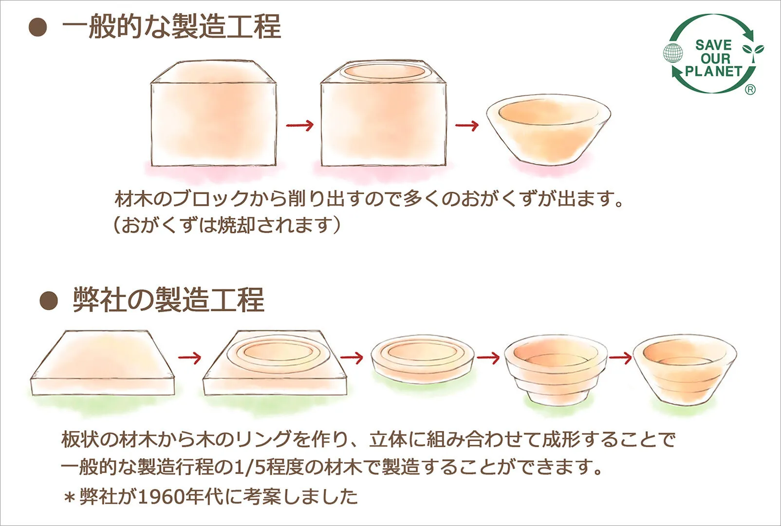 木材のブロックから削り出す一般的な製法と較べ、1/5程度の木材で製品を製造することができます。