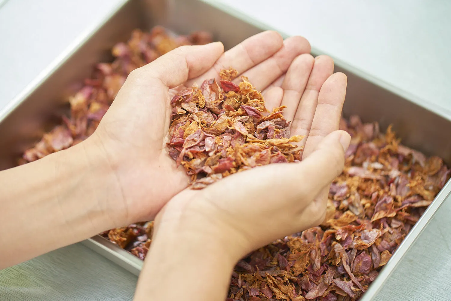 原料は甲州産のぶどうの皮。山梨県甲州市の「若尾果樹園」からワインパミスを仕入れ、枝や種を一つひとつ手作業で取り除きます。その後、一定期間砂糖漬けにすることで、風味豊かな「ぶどうのワンピース」が完成します。