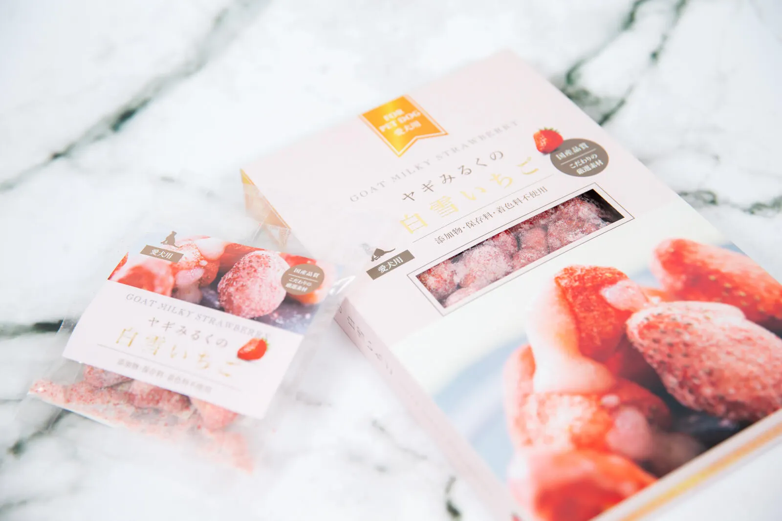 フリーズドライの苺に濃厚なヤギみるくを閉じ込めたプレミアムな味わい。