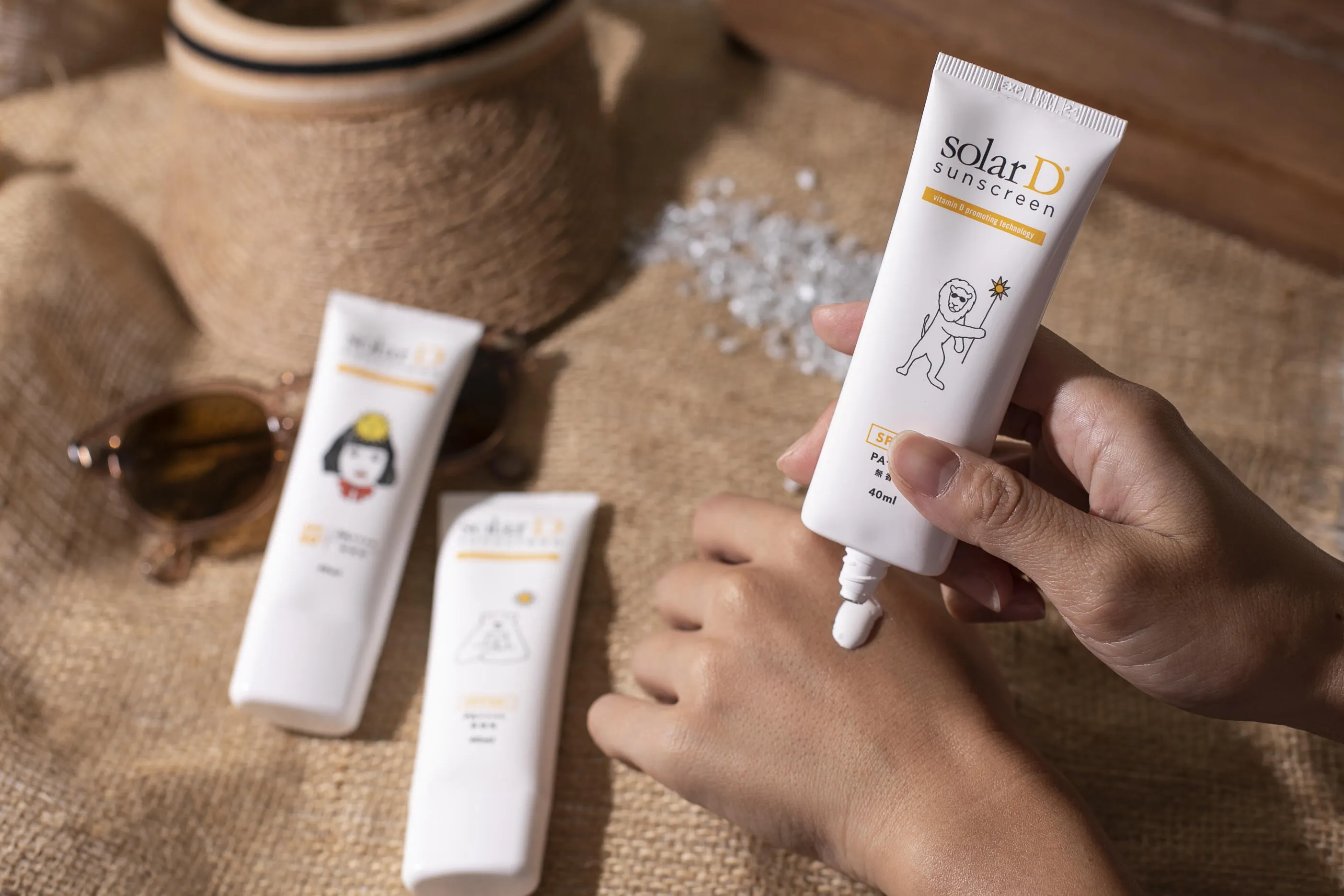 パッケージデザインのテーマは、”太陽を味方につける”。日焼けをしっかり防ぎつつ、太陽とビタミンDを愛する仲間たち(ライオン・シロクマ親子・女の子)がパッケージを飾ります。