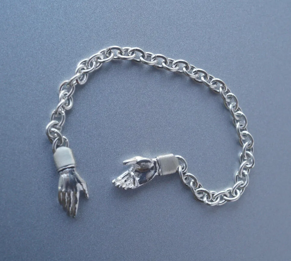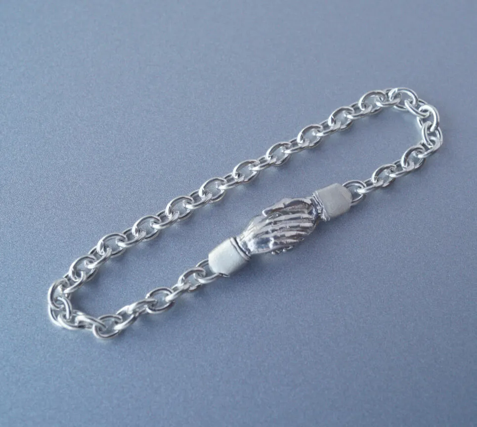 これは「人と人が手を取り合い生かされている」という僕らが一番大切にしている思いをそのまま表現したブレスレット。手のモチーフにカタチ取られた金具にフックが仕掛けられており、実際に手と手が握手するようにブレスレットの輪を一つに繋ぎます。
