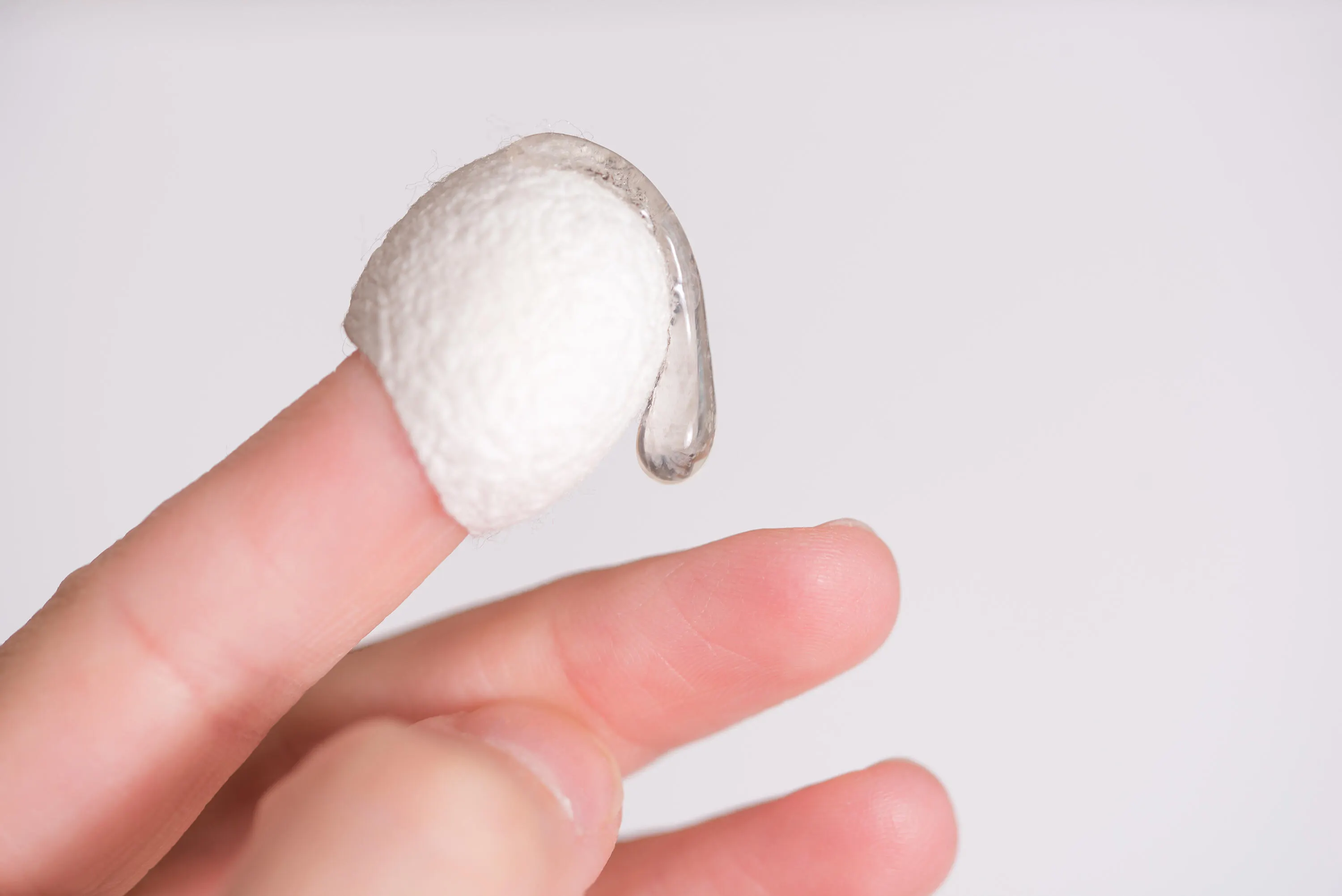 私たちは様々なシルク原料を使用していますが、UNIKならではの特別な原料(美容業界で使用されるのは初だと紹介されました)が"シルクナノファイバー(以下SNF)"です。特許を取得した製法で作られており、薬品を使用せず、シルク糸をそのままナノレベルに粉砕。それはご存じのシルクそのもの。SNFを手に取ると、サラサラとした滑らかな肌触りがします。