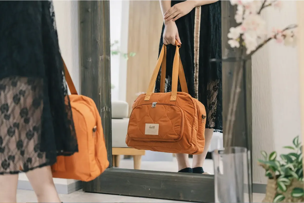 このトラベルバッグの最大の特徴である「スーツケース構造」は、単なる機能性の追求ではありません。両開きフルオープン構造により、荷物を詰める瞬間から、まるでスーツケースを使っているかのような特別感を演出します。素材には伸縮性のある2重構造の生地を採用し、多少荷物が増えてもストレスなくパッキングできる優しさを実現しました。