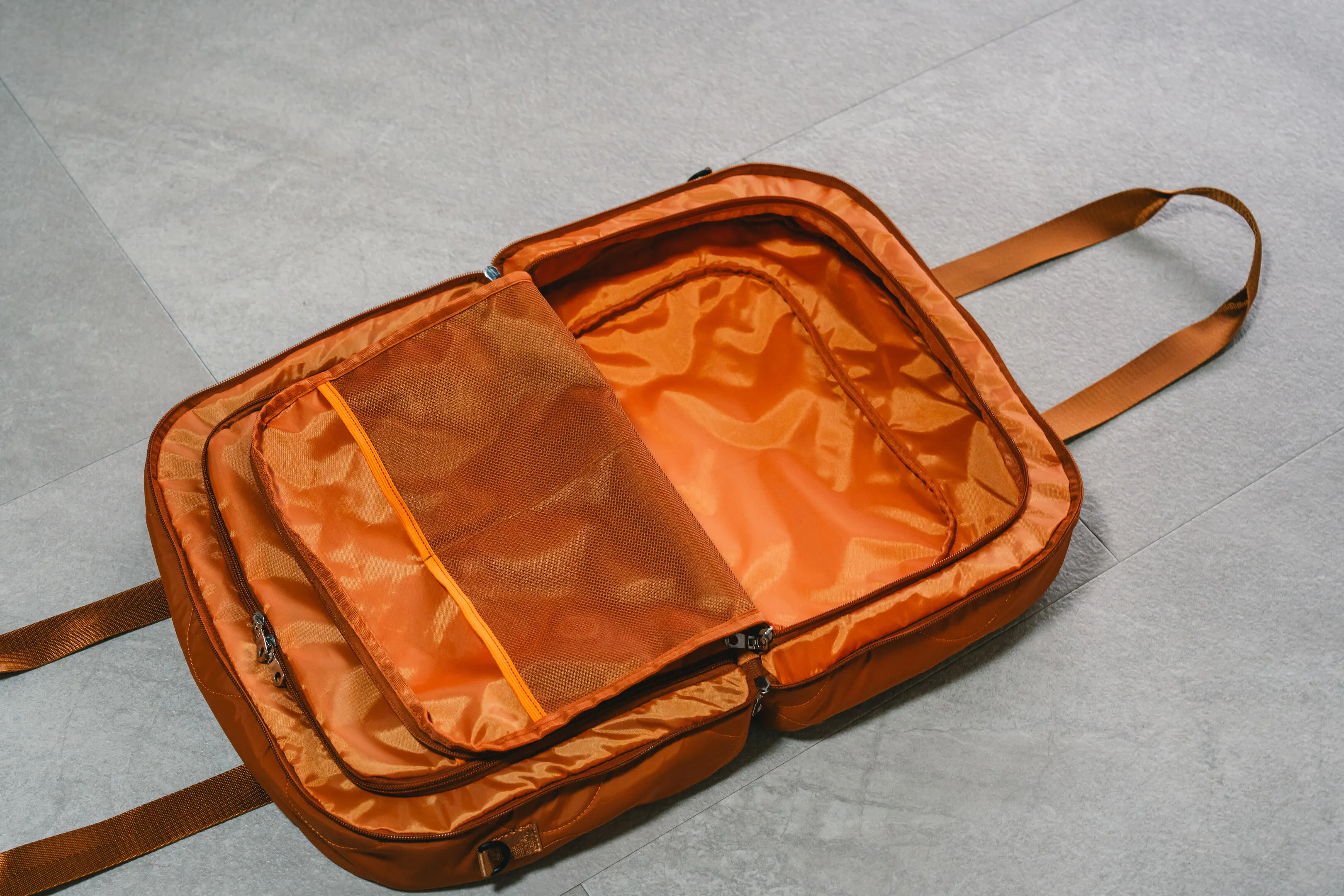 手持ち、ショルダー、斜めがけの3通りの持ち方が可能で、旅のシーンに合わせて自由にスタイルを変更できます。重量はわずか425gと軽量でありながら、大容量を実現。オレンジとネイビーの2色展開で、性別や年齢を問わずお使いいただけます。