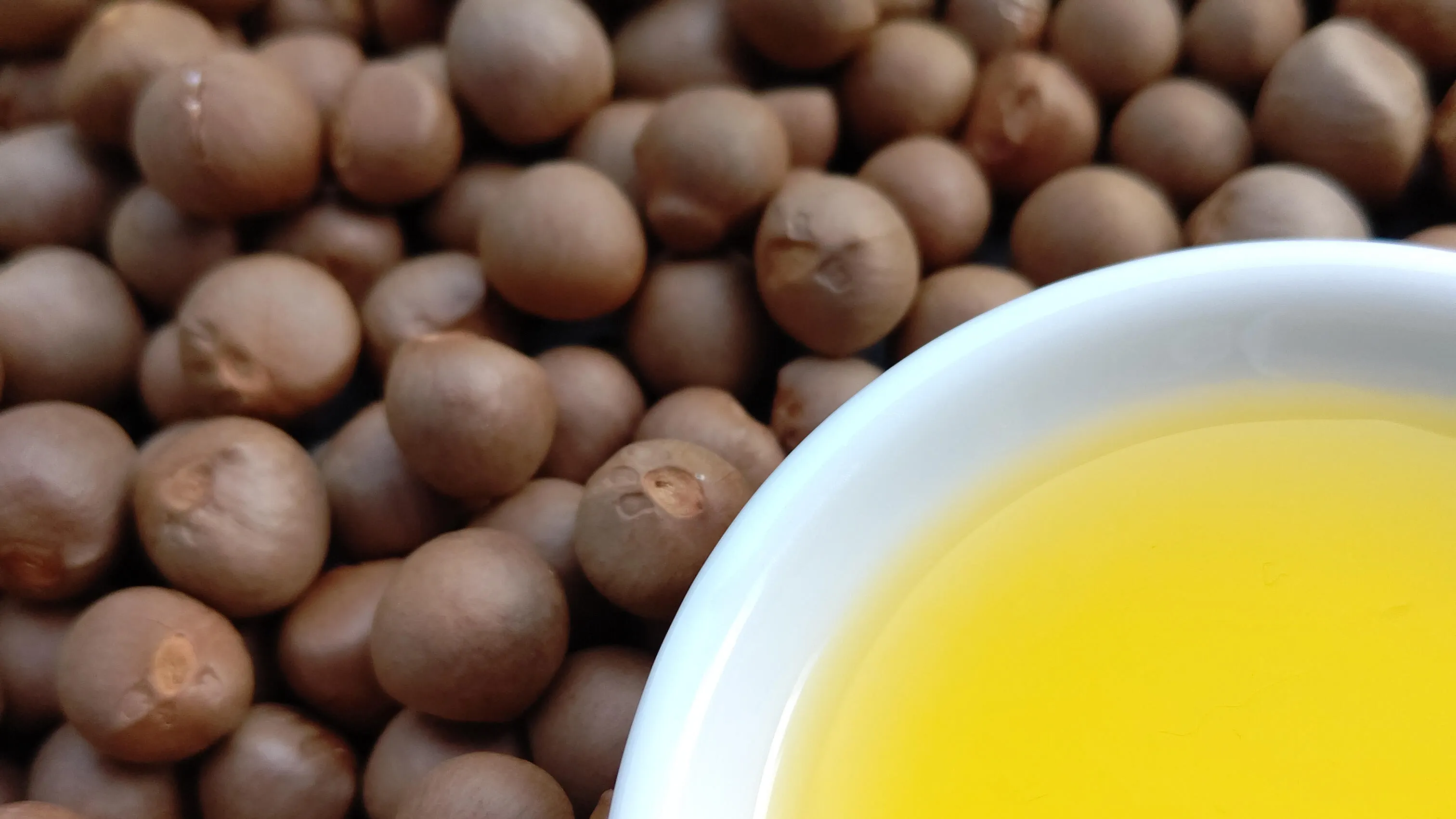 茶の実油の生産はほぼすべて手作業です。10月に茶園で茶の実をもぎ取り何か月か天日干し、よく乾いた茶の実を手作業で割って殻を外し保存可能な状態に包装します。毎年毎年たくさんの茶の実を手作業で搾油原料に調製しています。コールドプロセスで自然ろ過する油はまさに自然の恵みそのままです。茶の実の収穫も自社で行っている茶の実油商品ブランドは他にほとんどありません。