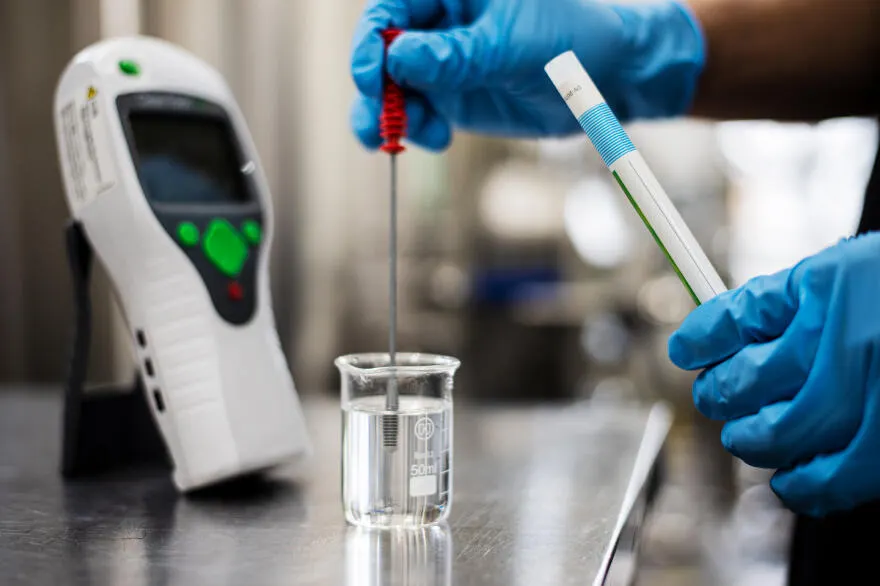 念入りな醸造設備の洗浄とアデノシン三リン酸の測定や製品の理化学的検査を行い常に衛生状態を確認しています。