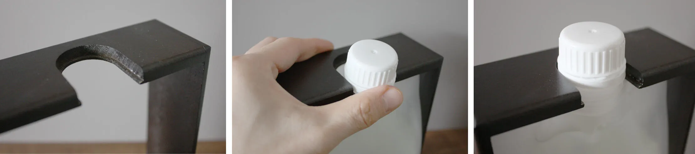 木製のウッドスタンドにリフィルがそのままセットされた形状で、中の液体が無くなるとリフィルを取り外し新しいリフィルを取り付けます。溝にはめるだけで取り付けは簡単。