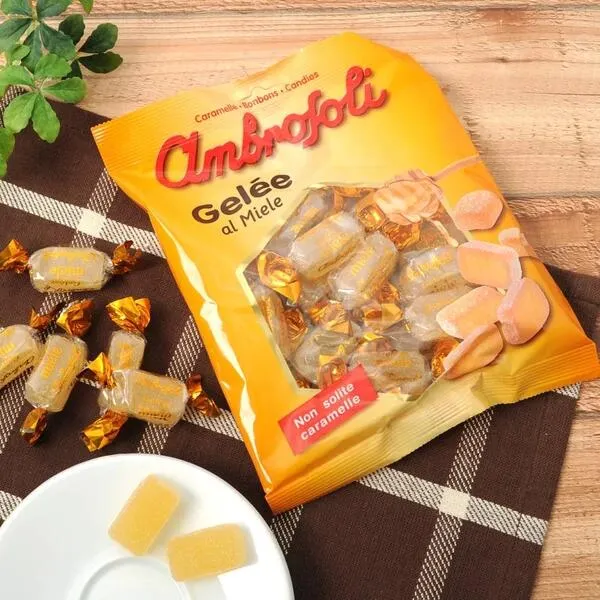 アンブロッソリーの製品は、どれも素材の良さとシンプルな美しさが際立っています。主力商品である「ハニーキャンディ(袋入)」は、イタリア最大の蜂蜜メーカーならではの豊潤な蜂蜜が中からとろけ出す逸品。砂糖・ぶどう糖シロップ・蜂蜜という最小限の材料で作られており、口に含むとまず外側のやさしい甘さ、そして中心から溢れる蜂蜜の濃厚な味わいが広がります。余計な装飾を排したパッケージは、都会的で洗練された印象を与え、ギフトにも最適です。