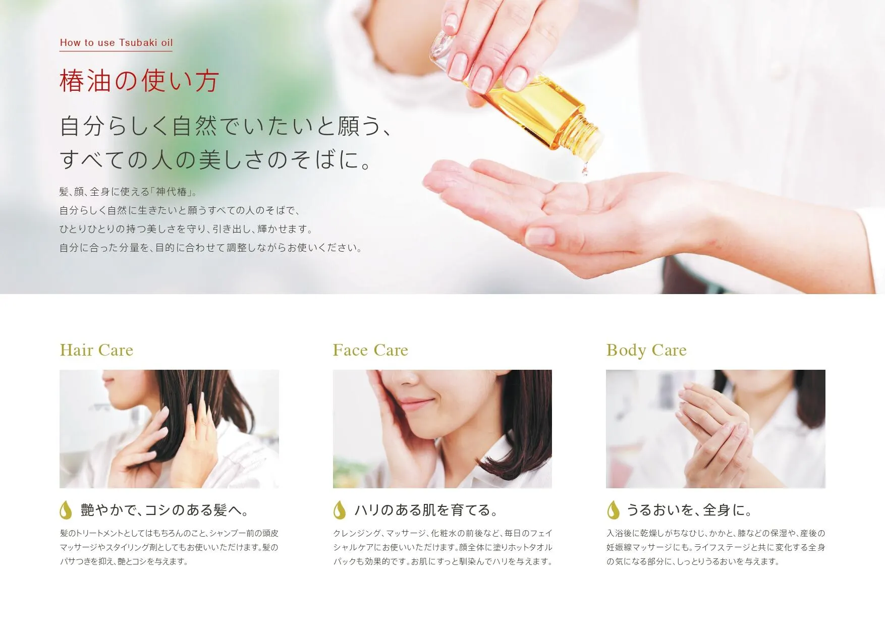 「神代椿」は、化学的なものを避け、自然由来の質の高い製品を求める方を主に、赤ちゃんからお使いいただけるほど肌に優しく、人生のあらゆるステージの方々にご愛用いただいております。特に、健やかな毎日を大切にされる高齢の方々には、長年にわたりご支持いただく大きなボリュームゾーンとなっております。