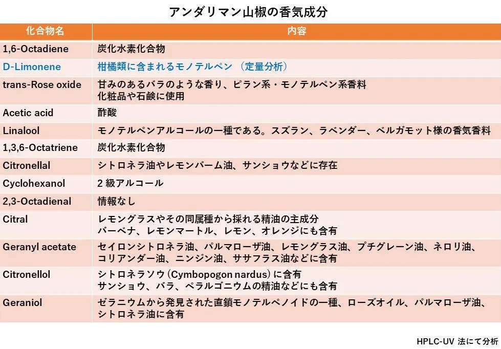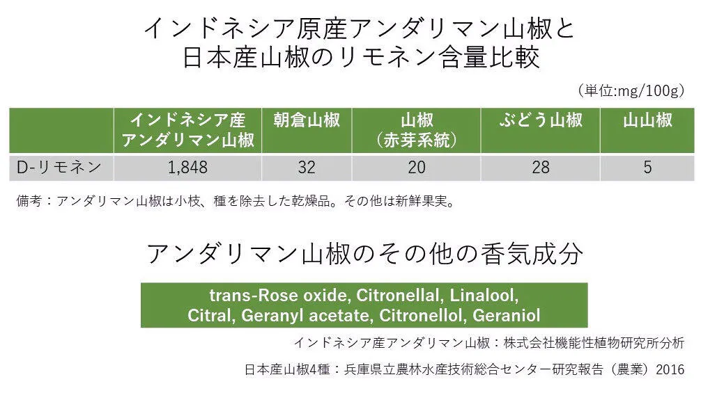 アンダリマン山椒の大きな特徴は、山椒特有の柑橘類様の香りが強く、分析では日本の朝倉山椒などのリモネン含量は50倍以上も含まれ、その他の精油成分も豊富で日本人の味覚に合う納得行く香辛料です。