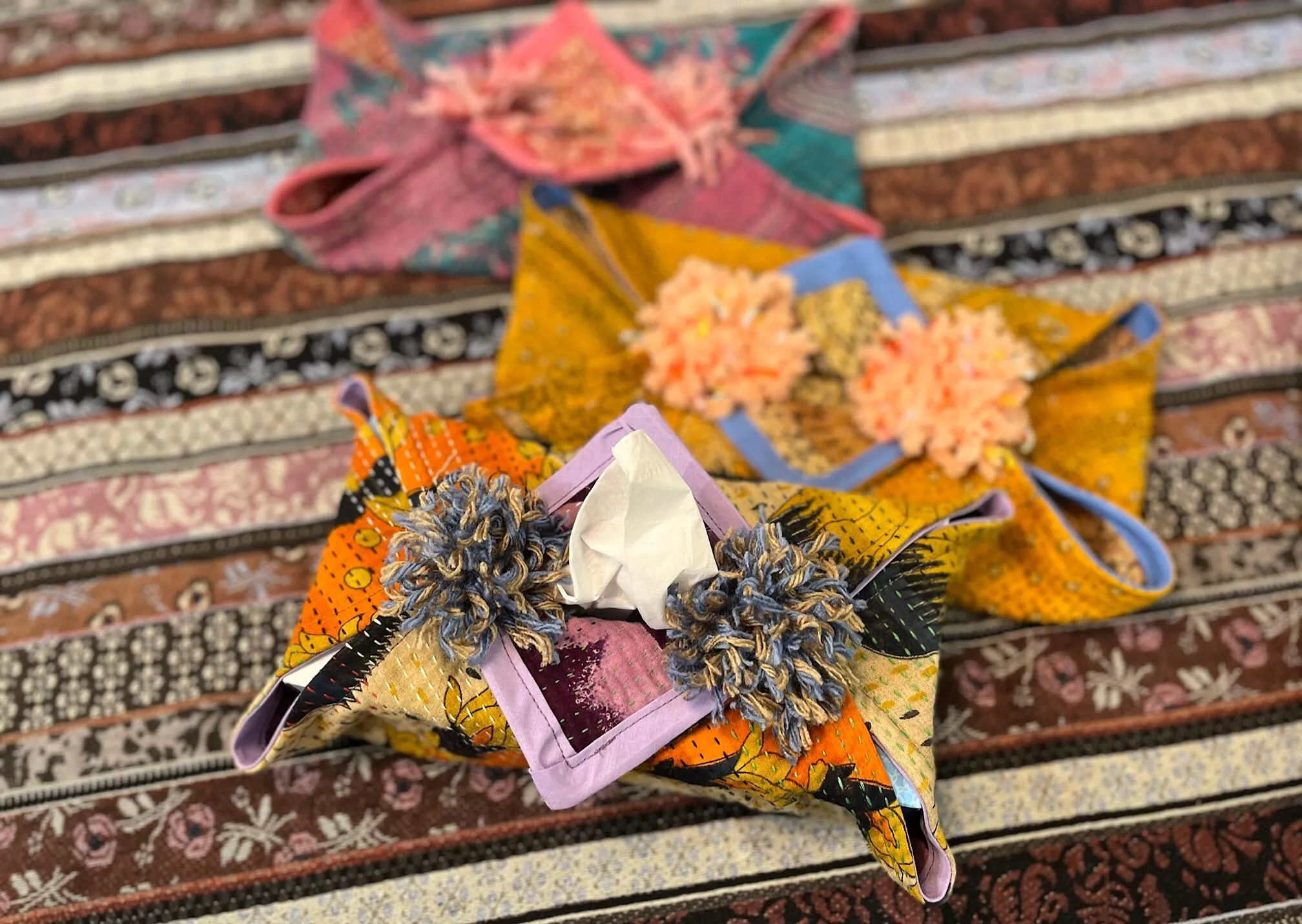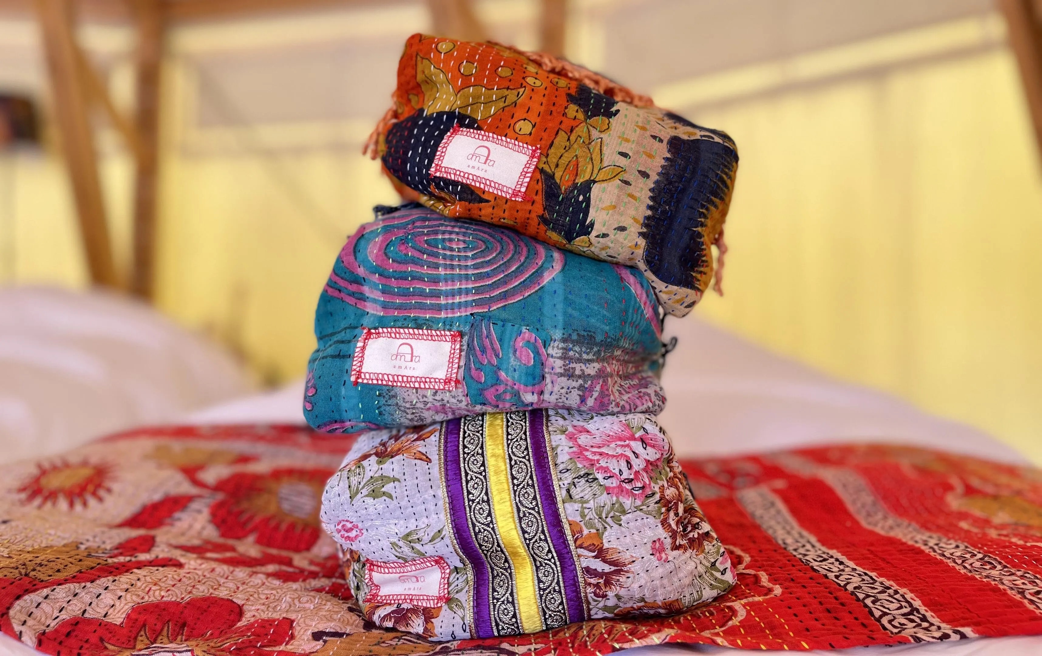 カンタは昔から花嫁道具として親しまれている伝統布で、使い古したヴィンテージサリーを数枚重ね