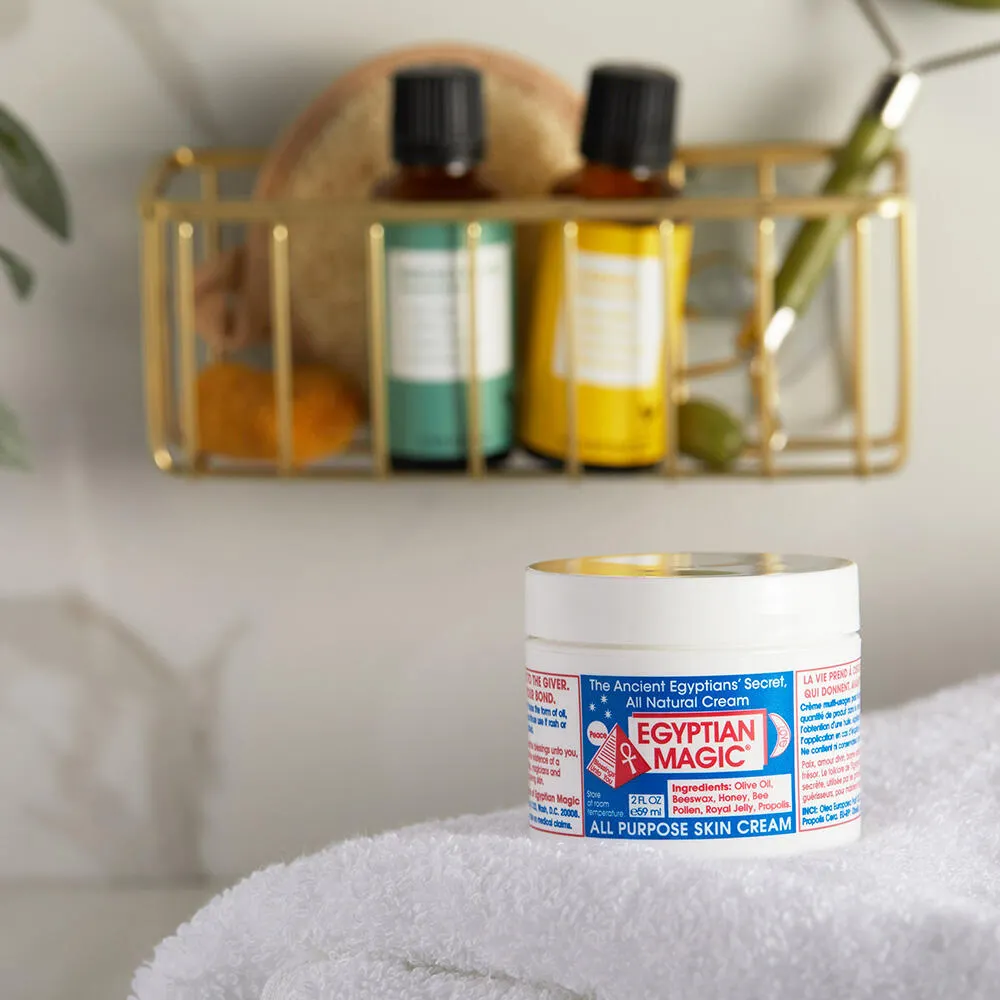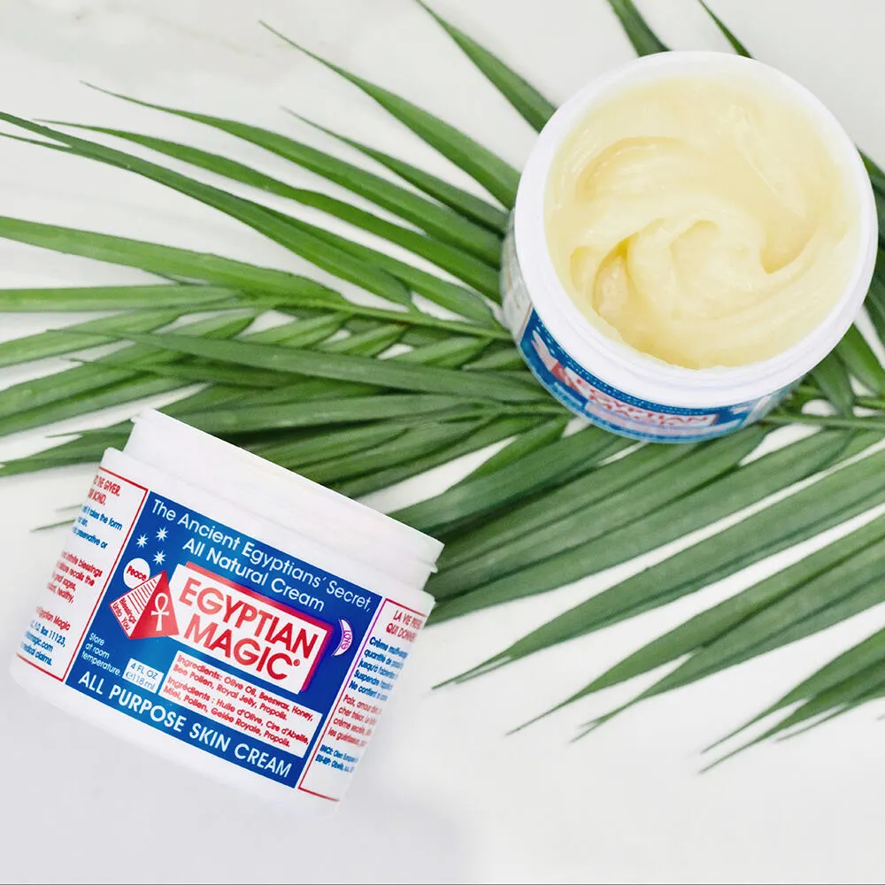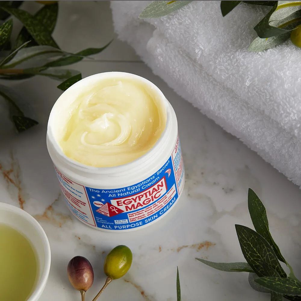 エジプシャン・マジックは、クレオパトラがお肌の輝きを保つために使用していたといわれる古代エジプトの処方に基づき、6つの天然由来原料をパワ フルにブレンドしたスキンケアクリームです。化粧下地・リップグロス・ヘアケア・ボディケアなど幅広く全身に使用でき、赤ちゃんからお年寄りまで年代を問わずお使いいただけます。