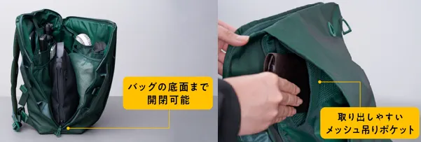●独自のL字開閉(意匠登録出願済)+メッシュポケットで、全体がパッと見えるため、ものを探す時間が省けストレスフリー。●16インチのPCも入る大容量なのに、スリムでシンプルなデザインで持ち運びに便利。●傘やボトルが入るサイドポケット、アクセスしやすい前ポケットなどこだわって設計された収納。●サイドハンドル付属でビジネスバッグとしても。ショルダーは背面ポケットに収納可能で、キャリーオンも可能。