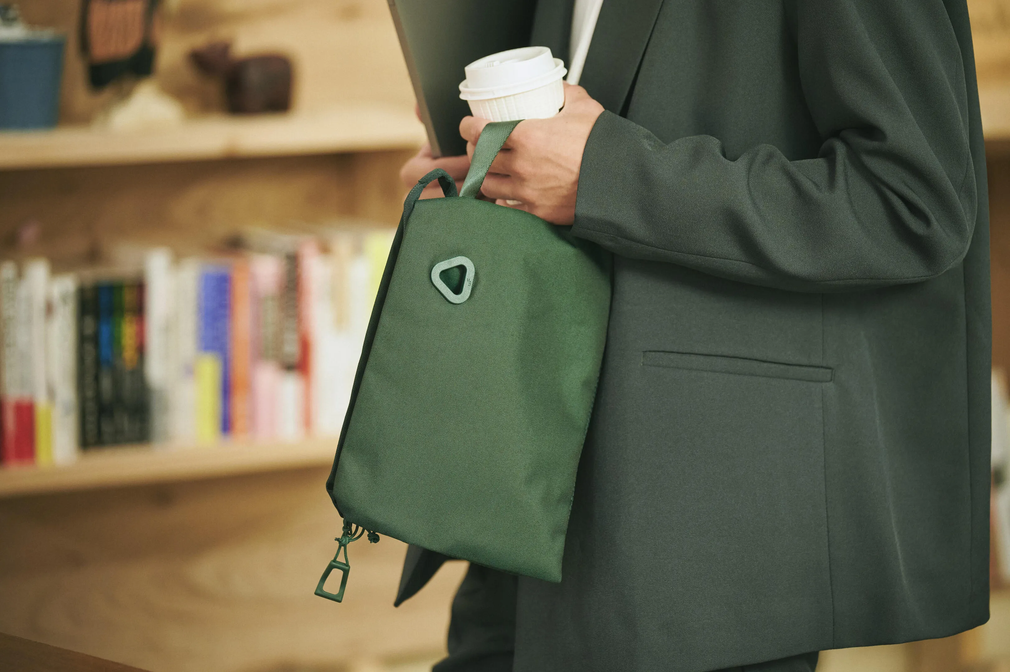 ペットボトルからリサイクルして作られた生地や、廃棄される予定だった革端材を再利用した素材を使用して商品を開発。環境への負担を減らし、持続可能な社会に貢献。