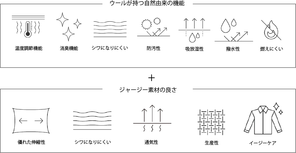 素材のウールは光沢感や肌触りにこだわり、着心地にを良くするために伸縮性に優