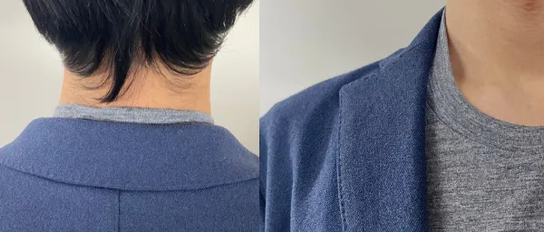 衿の前側は普通の衿巾ですが脇から後ろ衿に向け巾を太くすることで、ジャケットの衿が直接肌に触れない設計になっていますので、ジャケットの衿が黄ばんでしまうなどの問題を解決できます。