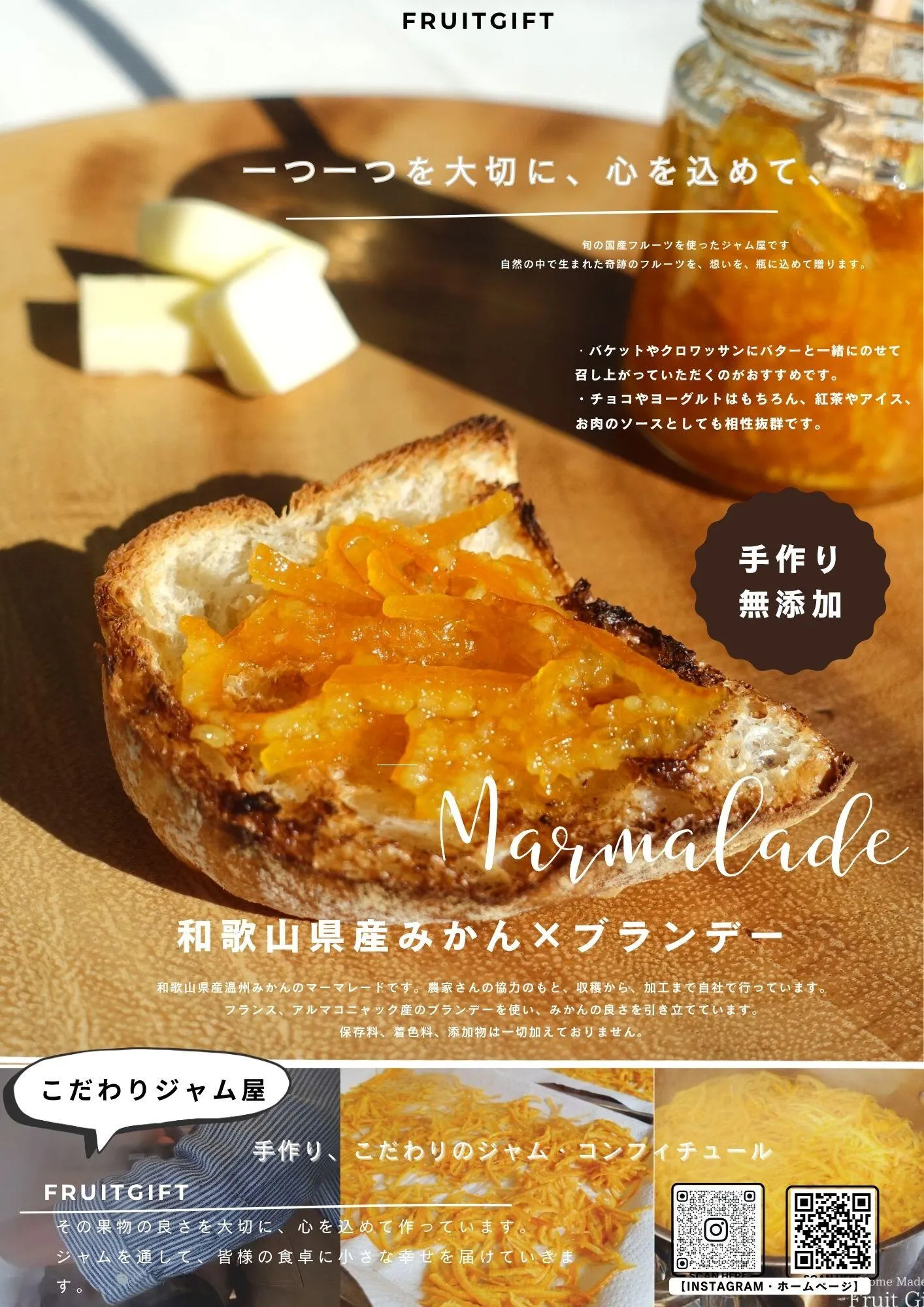 私たちのジャムづくりへのこだわりは、素材選びから製法、そして味わいのバリエーションにまで及びます。「マーマレード(和歌山県産温州みかん×ブランデー)」は、和歌山県産の旬の温州みかんを皮ごとたっぷり使用し、一鍋ずつ丁寧に手作りしています。フランス・アルマコニャック産のブランデーを加えることで、みかんの甘みと皮のほろ苦さが絶妙に調和し、上品で贅沢な味わいに仕上げました。焼きたてのパンにバターと一緒にのせるのはもちろん、ヨーグルトやアイス、さらには唐揚げや煮豚などの料理にも相性抜群です。お客様からは「パンに塗るのがもったいない」「皮の部分がめっちゃおいしい」といった声を多数いただいています。