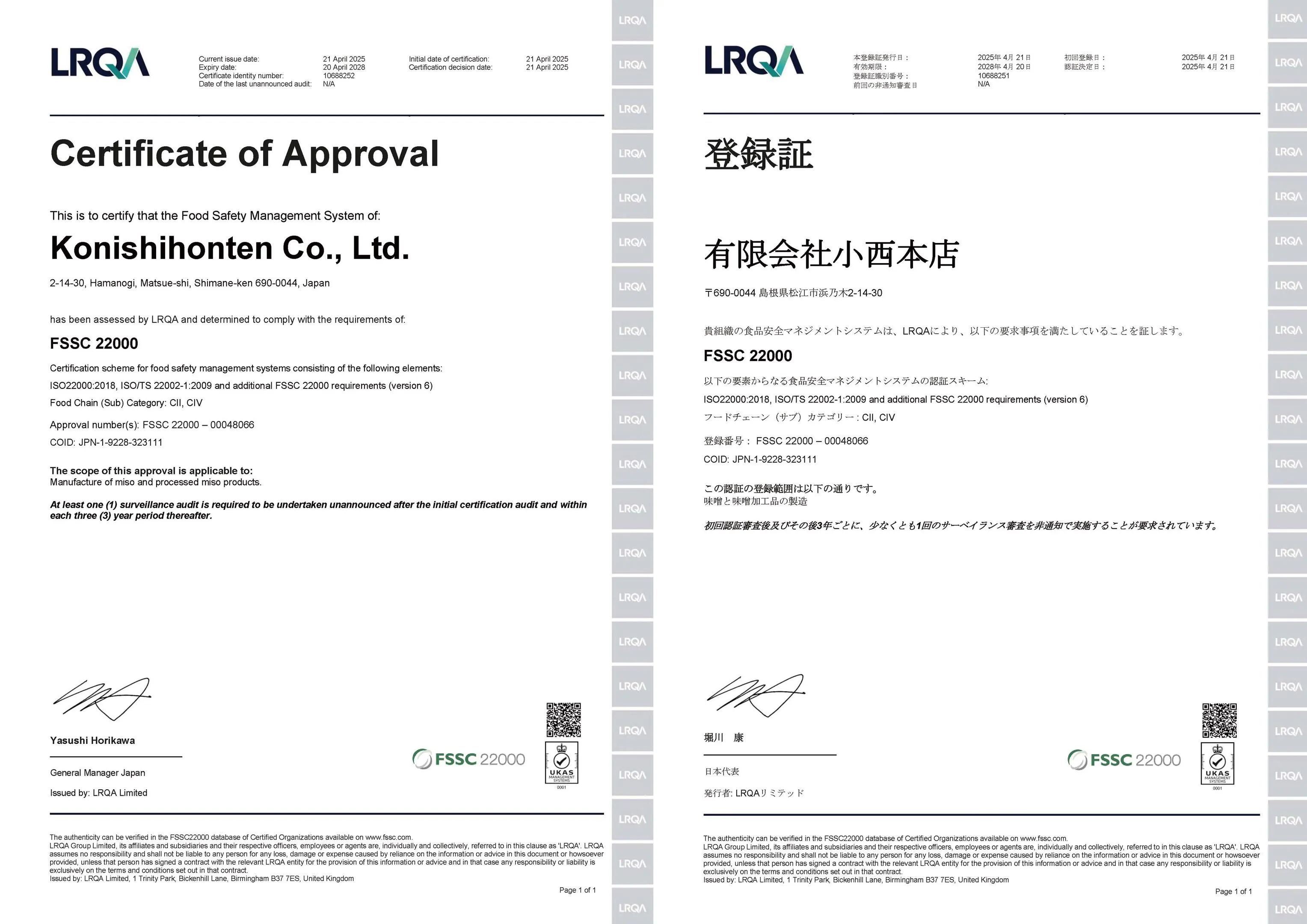 2025年4月に国際規格の「FSSC22000」を本社工場にて認証取得しております。