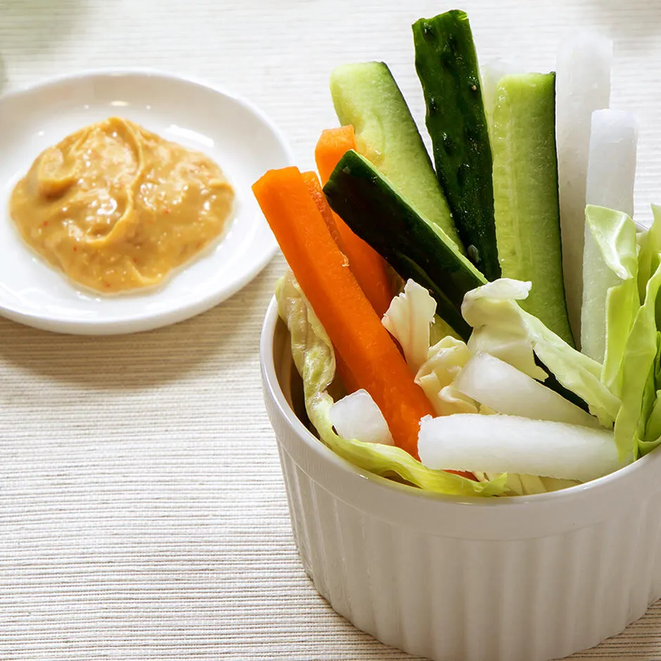 錦味噌の「白みそ」は約25%ほど脱皮した大豆を使用します。米糀の割合が高く、雑味を削ぎ落とした大豆のうまみと上品な甘みを持ち合わせた味噌です。味噌汁、炒め物、漬物などはもちろん、マヨネーズと混ぜて野菜スティックのディップなどにも最適です。