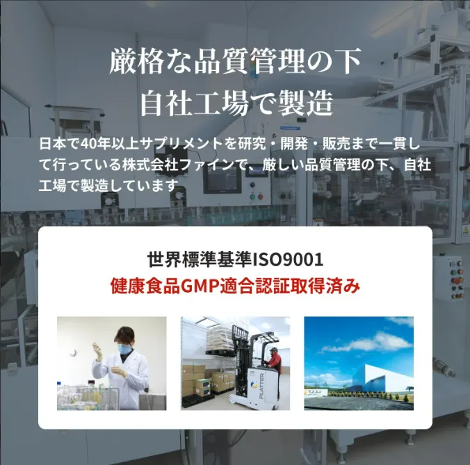 本シリーズは日本で40年以上サプリメントを研究から製造を行っている株式会社ファインの自社工場で製造(ISO9001、健康食品GMP適合認証取得)