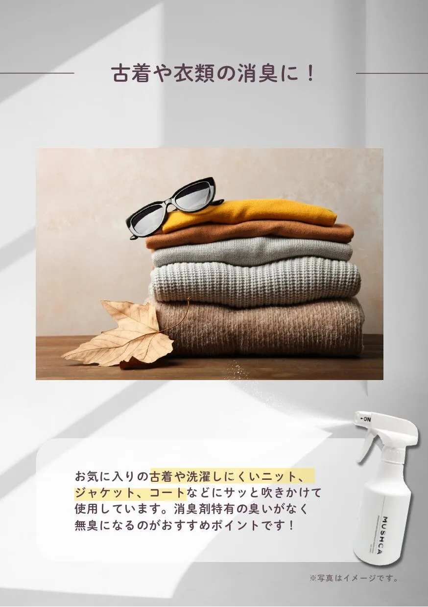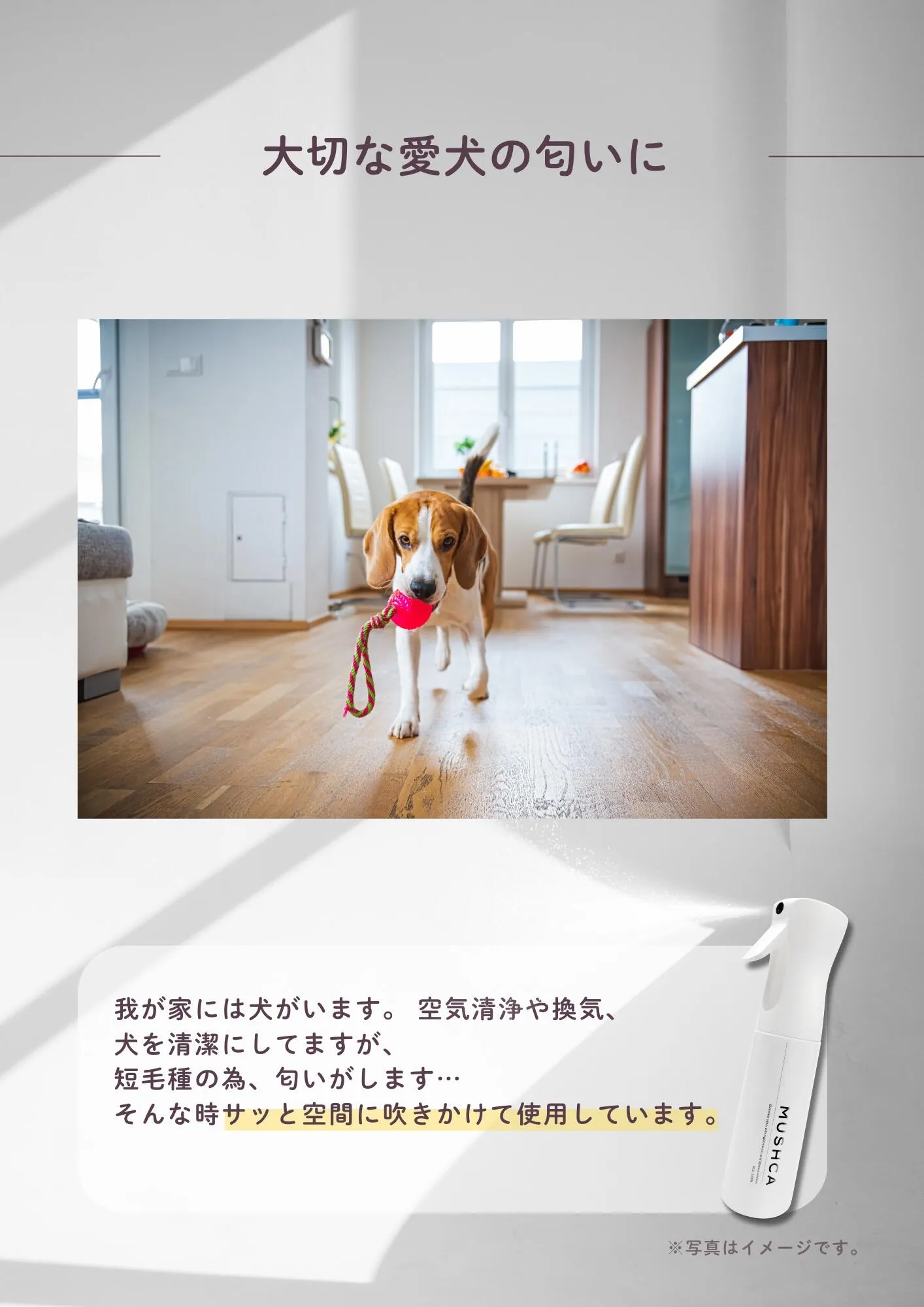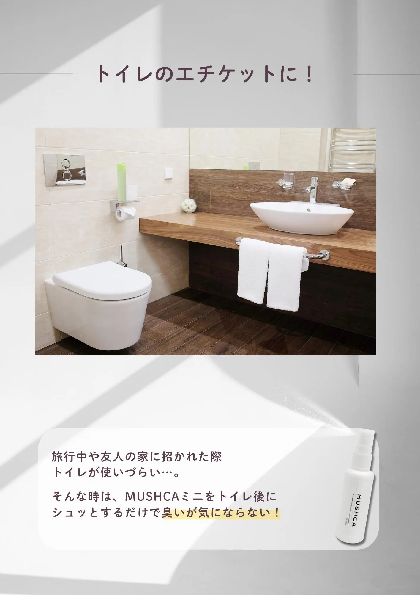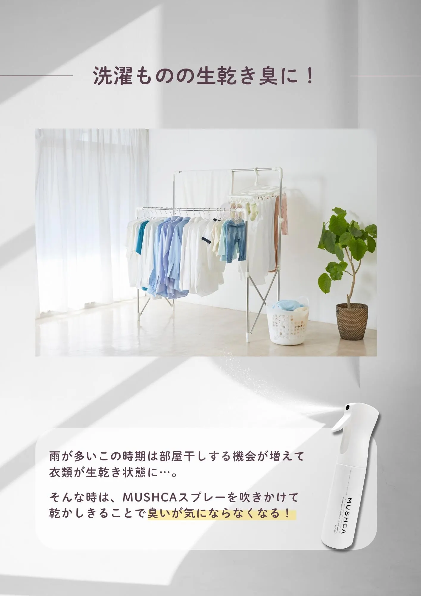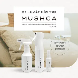 イヤなニオイだけを消して、香りも成分も残らない新感覚の消臭「MUSHCA」。 香りでごまかさずに無臭化を目指す、消臭スプレーです。