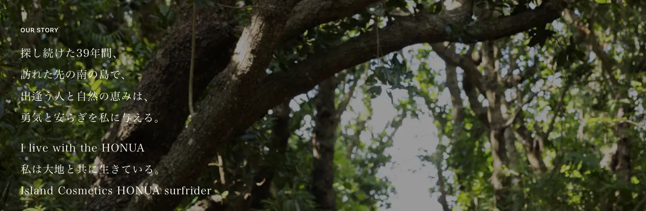 「I live with the HONUA(私は大地と共に生きている)」という言葉には、自然と調和しながら生きることの大切さ、そしてその恵みを次世代へと繋いでいきたいという願いが込められています。HONUA Surfriderは、島に伝わる伝承薬や植物の力を学び、天然由来にこだわった化粧品を通じて、現代人の心と体に安らぎと活力を届けたいと考えています。