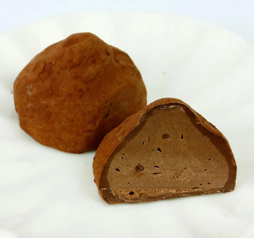 は、ほろ苦いココアパウダーでコーティングされたリッチでクリーミーな風味が魅力。口に入れた瞬間にとろけるなめらかな食感と、カカオの深いコクが広がります。