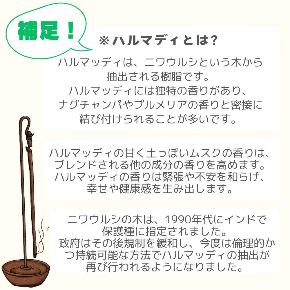 私たちが大切にしているのは、自然の恵みをそのまま活かした製品づくりです。ヒマラヤ山脈の麓で育まれた芳香植物や、インドの伝統的な製法で作られるハルマディ(ニワウルシの樹脂)など、厳選された天然素材のみを使用しています。