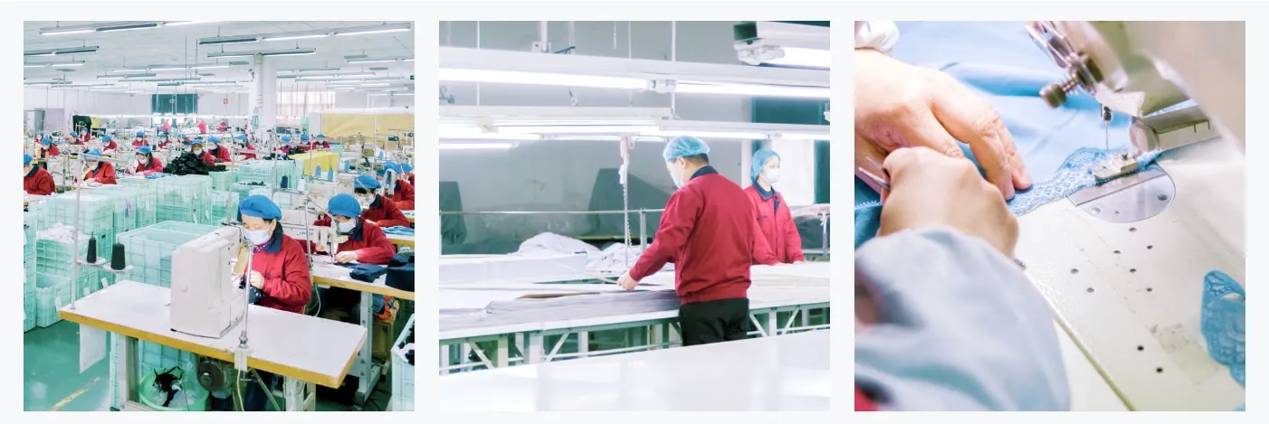 チーカスの商品生産の要となるのは、海外にある3つの自社工場。勤続40年以上の熟練スタッフを中心に、約120人体制で全6工程を担い、1日最大約1万枚を生産。良好な作業環境のもとで、日本と海外で常に連携を図りながら商品生産を行なっています。
