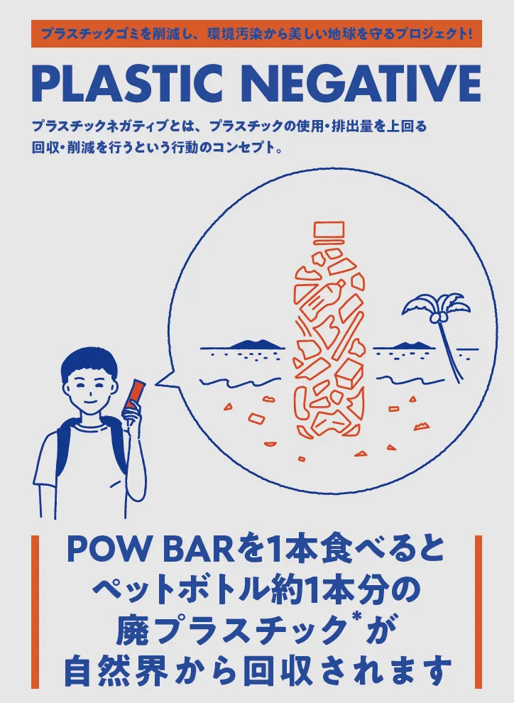プラスチックネガティブ認証のもと、POW BARを1本食べるとペットボトル約1本分の廃プラスチック*が自然界から回収されます。