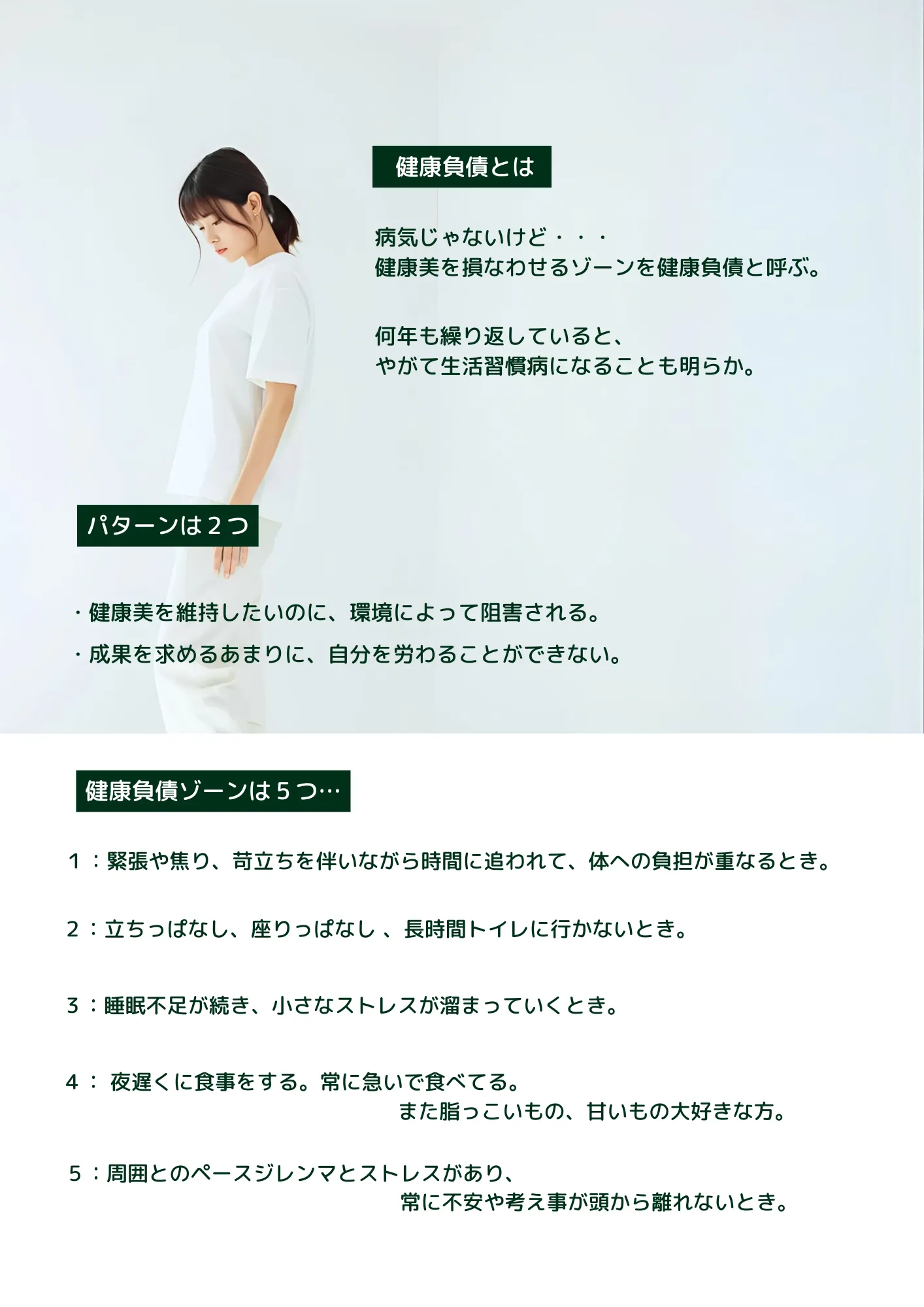 【3つの重なりがe:FORCEを飲むとき】 ●疲れが戻りにくくなるとき ●まだまだやることが沢山ある時 ●健康美を損ねる健康負債ゾーンにいる時