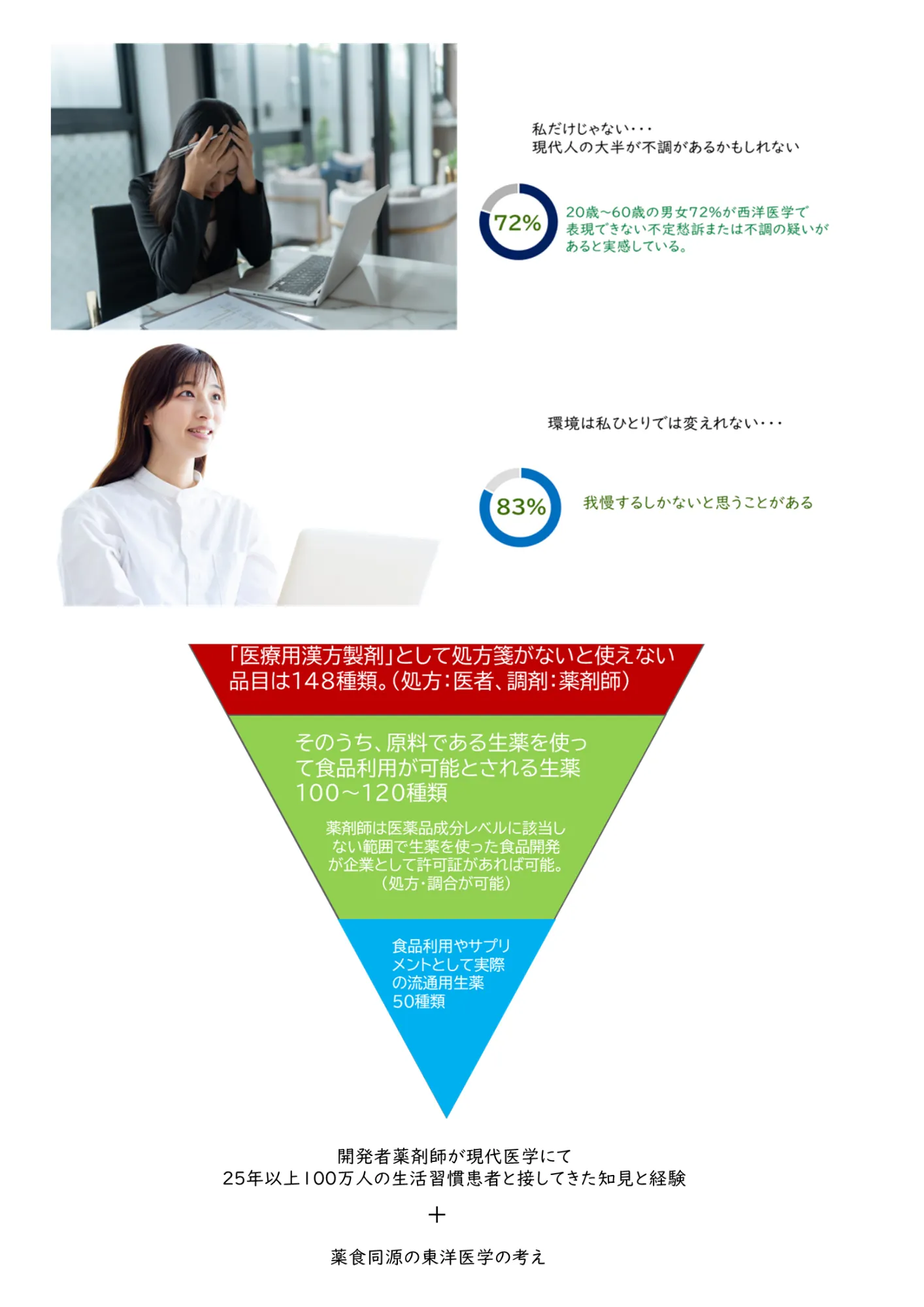 薬剤師が開発したフェムケア設計の和漢ドリンク。睡眠・疲労感・冷え・ストレスケアにカフェインレス・低GI設計。500人試飲で飲みやすさ実証。全国170か所で販売。