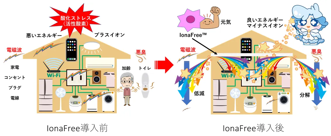 そこで、空気中の余計なエネルギー、化学成分などを分解し、体に良いエネルギーの供給をサポートする塗料をクロス壁に塗付し、「あなたのお部屋をパワースポットにリフォーム!™」するIonaFree™を企画・開発しました。