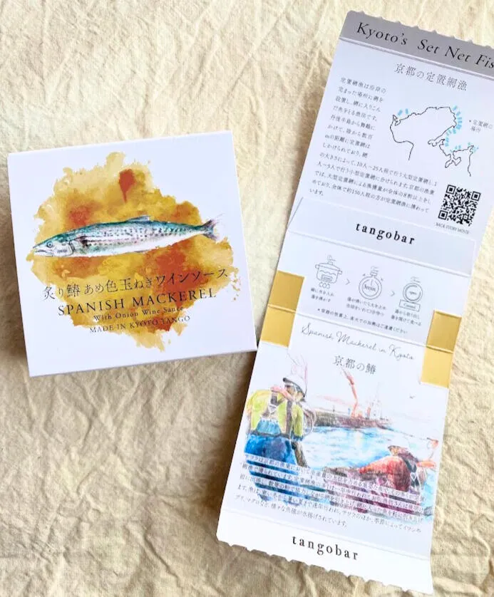 パッケージには、手書きの鰆と定置網量の様子のイラスト、京都の定置網漁についてのストーリーが載っており、パッケージ内のQRコードからは、定置網漁の様子を動画でご覧いただけます。
