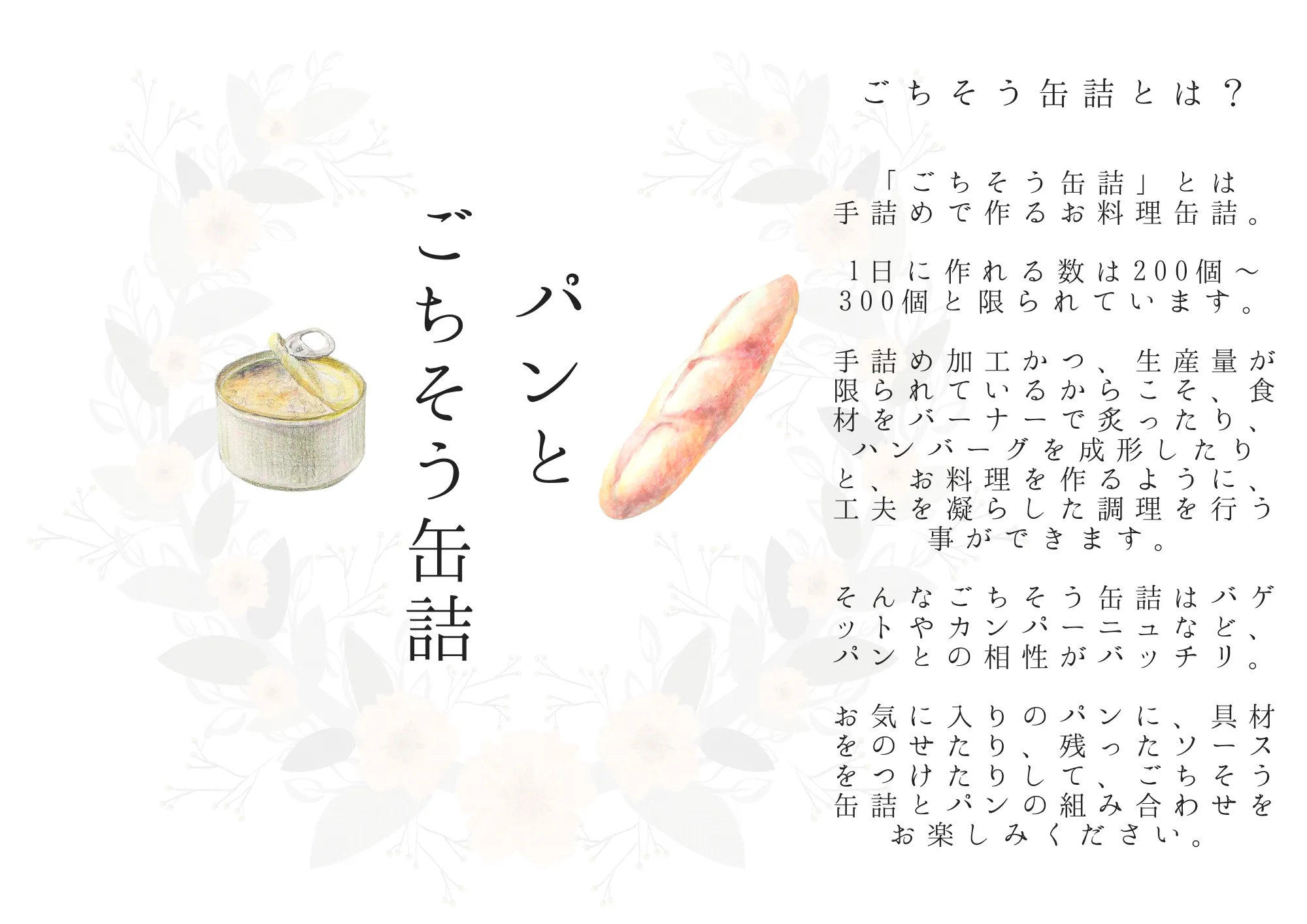 ごちそう缶詰とバゲットを合わせていただく事で、手軽に本格的なバゲットランチを楽しんでいただく事ができます。