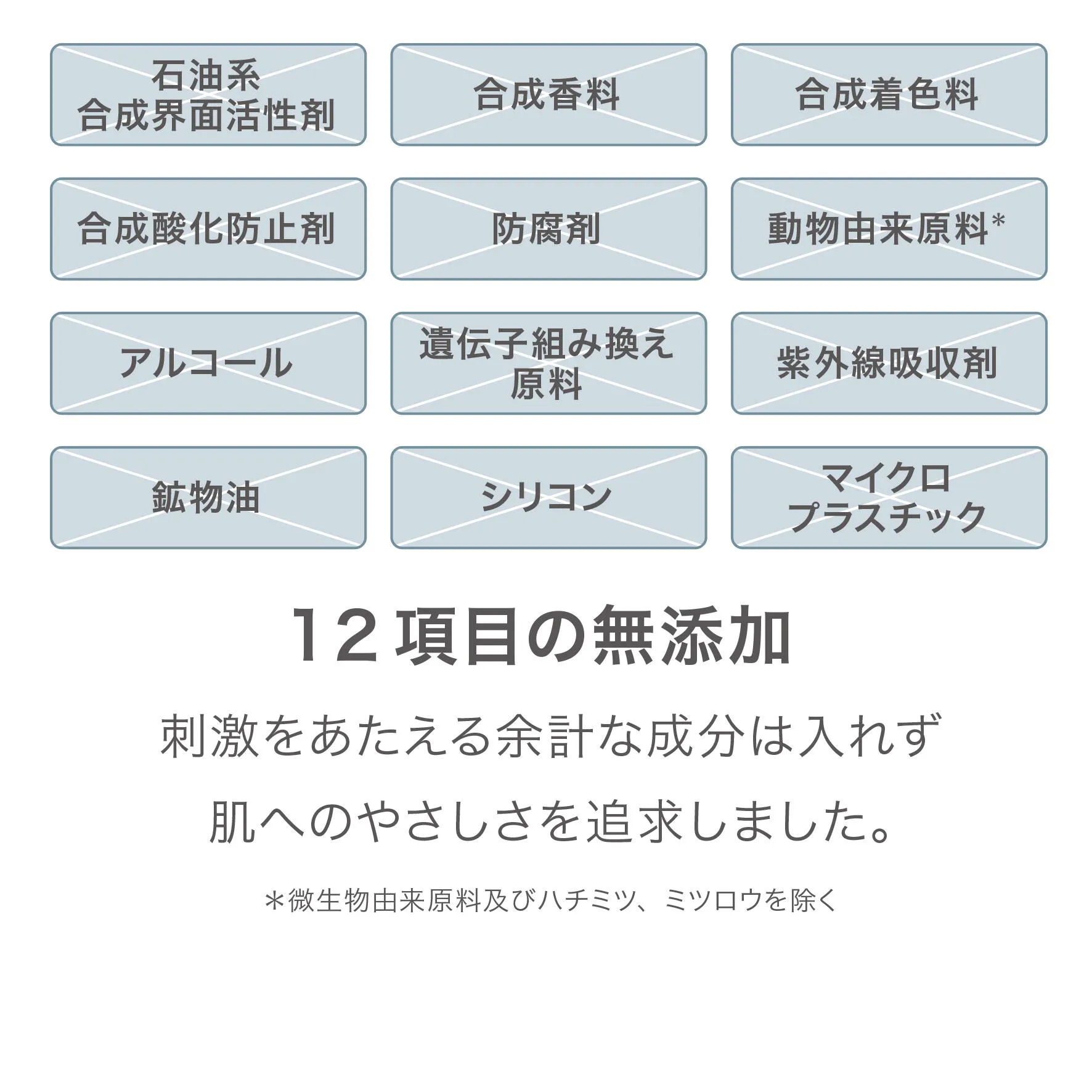 12項目の無添加(石油由来の成分、合成香料、合成着色料、防腐剤など、リスクのある成分を徹底排除)。