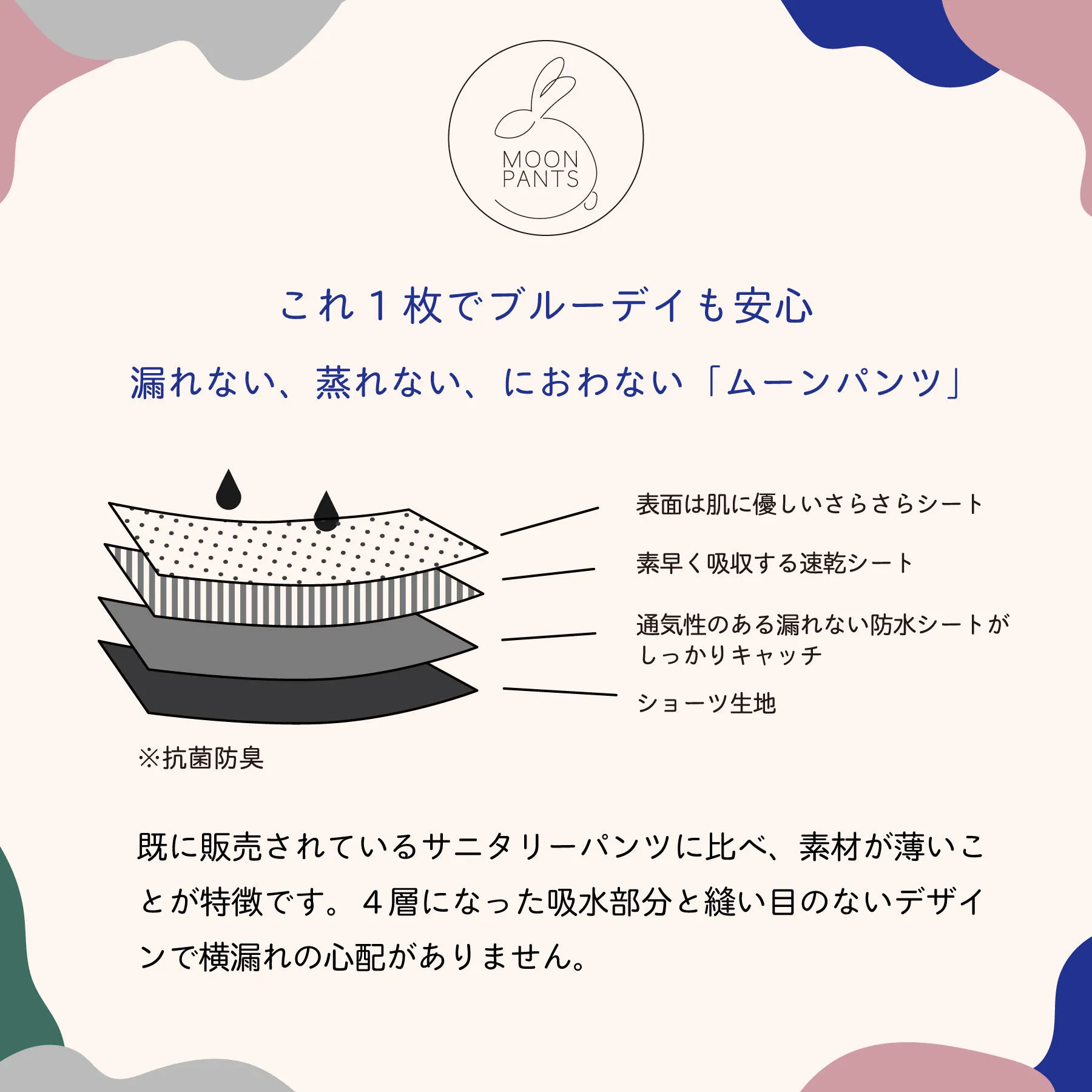 ムーンパンツは15〜20mLの液体を吸収。生理中もナプキン不要、サラサラ薄手で通気性◎、普段使いにも最適です。突然の生理・不意な尿漏れも安心してお使い頂けます。