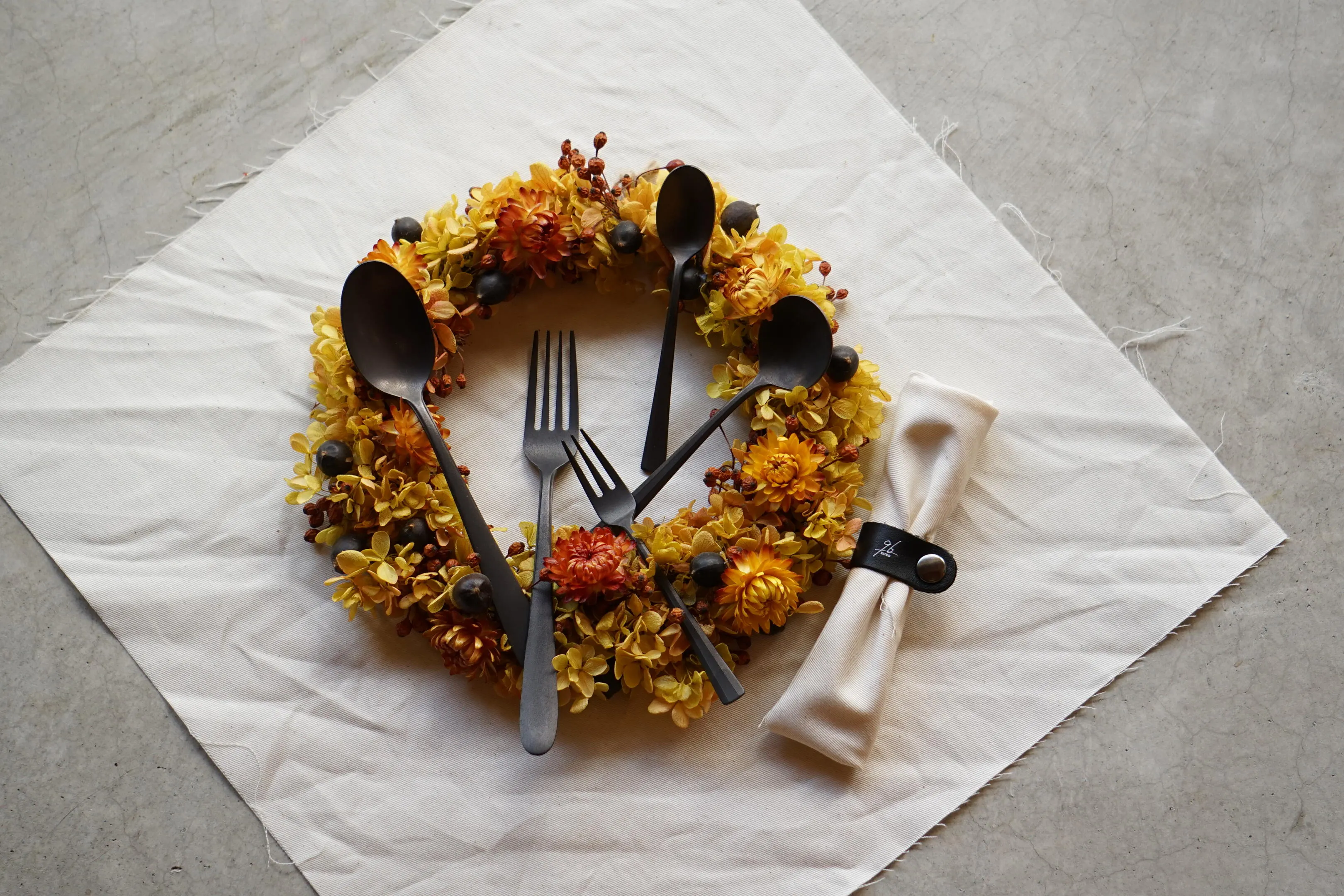金属を黒染めすると、ムラや液ダレ跡、孔食と呼ばれる斑点が出るなど、塗装のように均一的な質感にはなりません。それが黒染めにしか出せない味のある美しさであり、温度感のある黒になります。黒染めの魅力は風合いだけではなく、金属の質感を保ちます。この黒染めは太古からの自然現象に由来した人体に影響のない染色技術で、環境にもとてもやさしい処理であることも特長です。