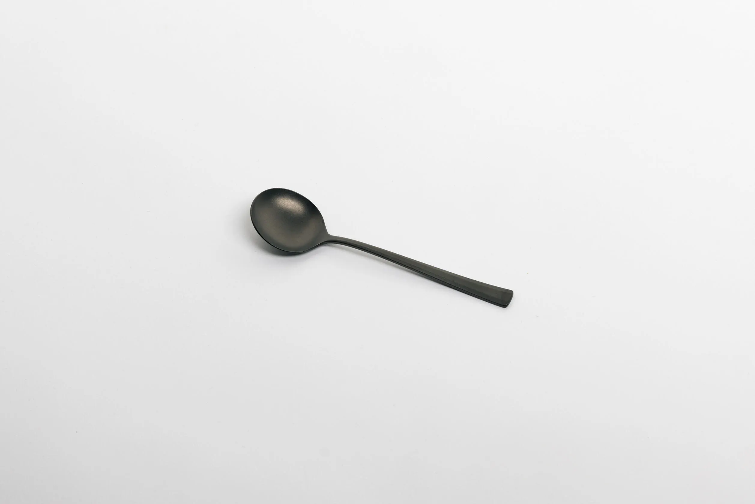 96【KURO】シリーズの中でも特に人気の「ざらざら」の、コロンと丸いフォルムが可愛らしいスープスプーンです。