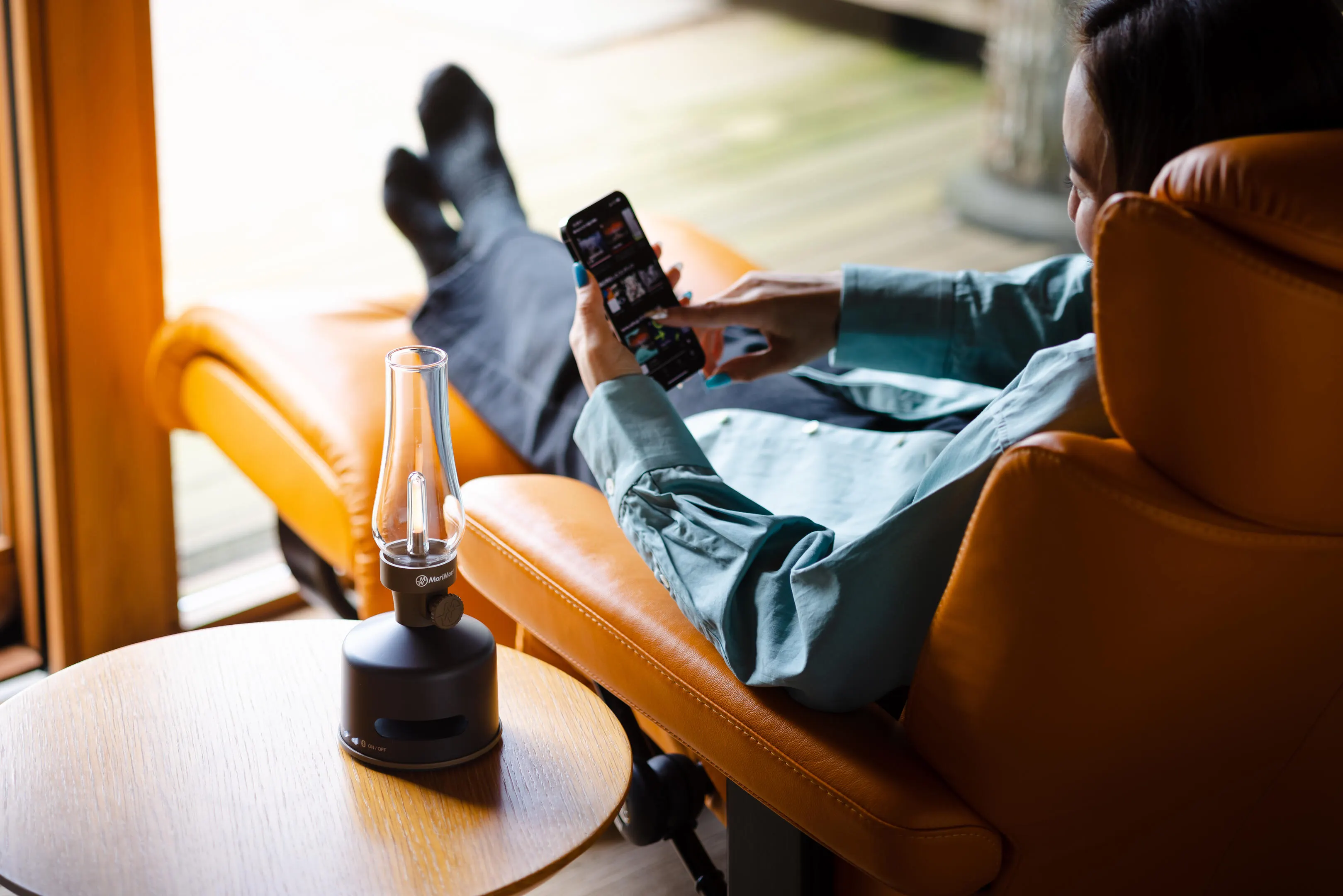 ノスタルジックなフォルムに現代的な機能、ワイヤレスBluetoothスピーカーが隠されスマホなどとペアリング音源再生、ロウソクの灯りを想わせるLEDは暖かく空間を灯します。一度の充電で、灯り、音楽を好きな場所で楽しむことができる実用的な製品です。