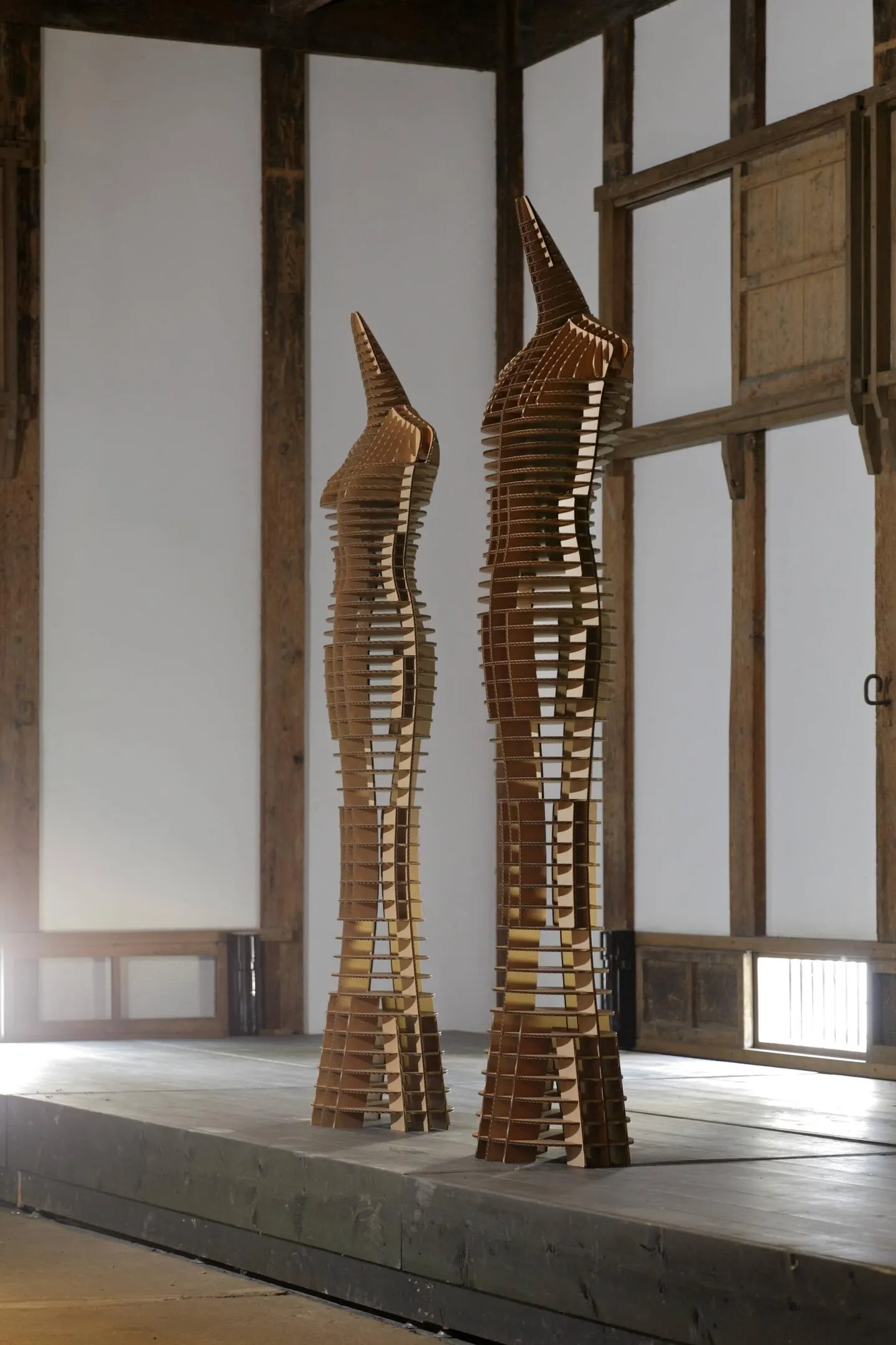 FLATSはいわゆる「表面」を持ちません。表面にあたる部分はレーザーで切り出され内部構造が露出した段ボールシートの断面が非連続的に連なります。鑑賞者はそれらの部品と部品の間をイメージで補完し、ひとつの像として認識します。この架空のフォルムはそれを支持する建築的な構造によって成り立っており、フォルムと構造のバランスがFLATSの商品としての最も大きな特徴です。