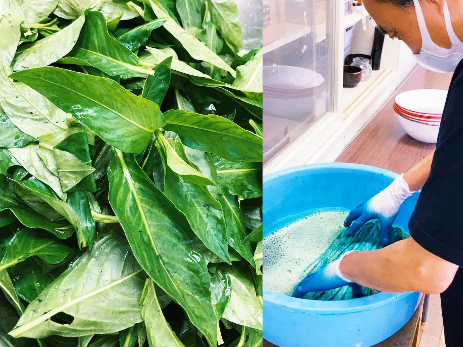 小田原の耕作放棄地で栽培された藍を摘み取ってすぐにその生葉で手染めした麦ブレード