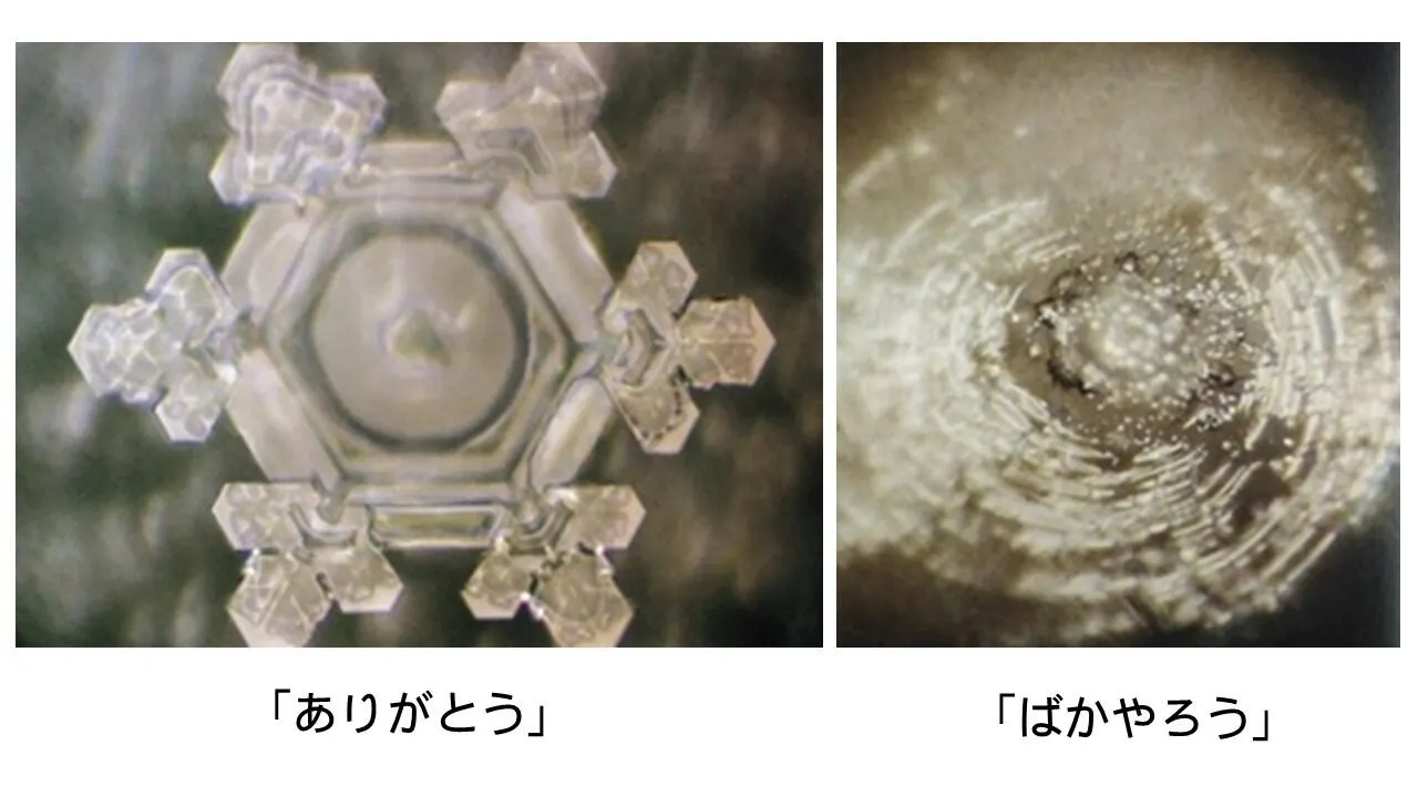 「ありがとう」や「愛」のようなポジティブな想いは美しい水の結晶を作り、ネガティブな想いはくずれた結晶をつくるそうです。