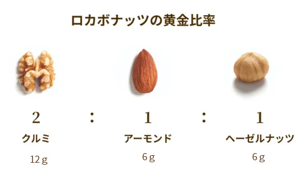 1食分(個袋24g)の量はクルミ12g、アーモンド6g、ヘーゼルナッツ6gの黄金比率。この2:1:1の割合は、2013年にスペインで行われた研究(PREDIMED試験)を参考としてデルタが独自に配合したものです。
